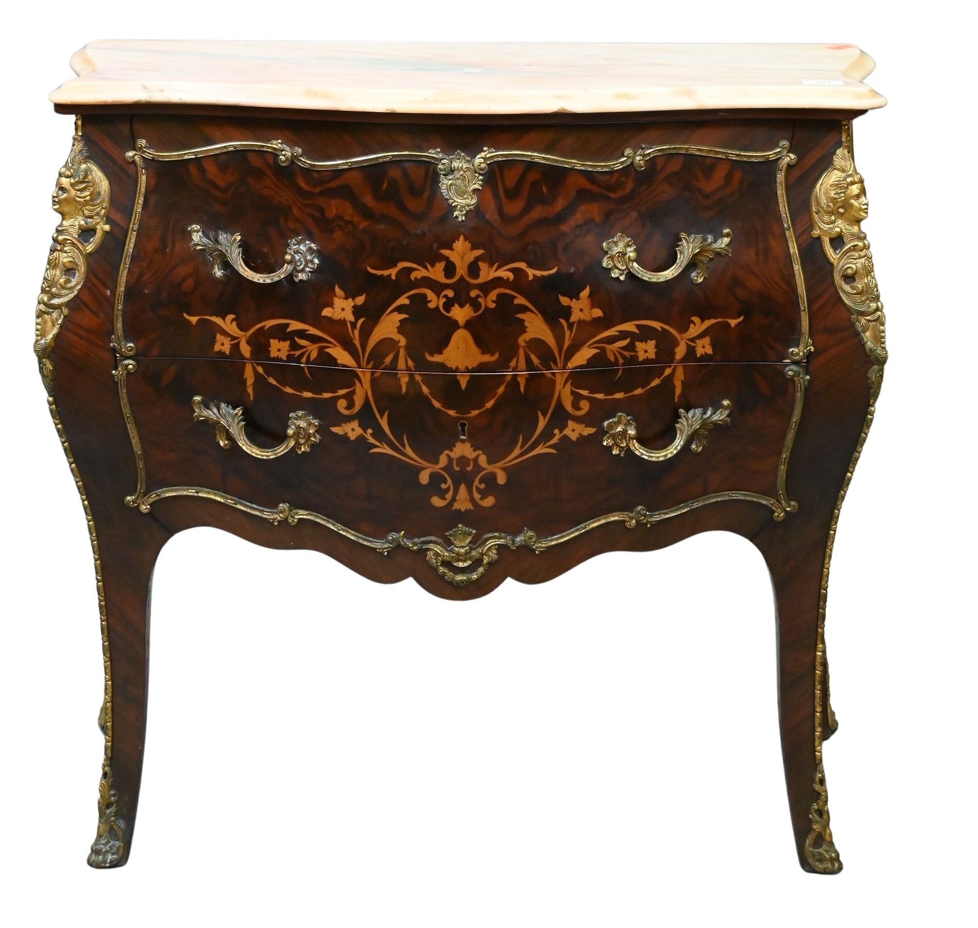 shaped marble top over two drawer, ormolu mounts with female bust all over claw paw feet