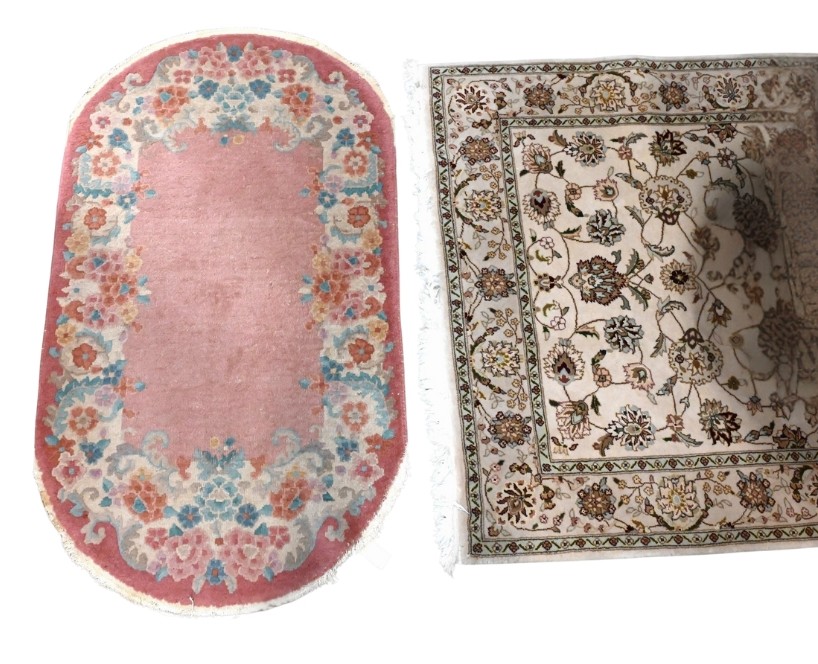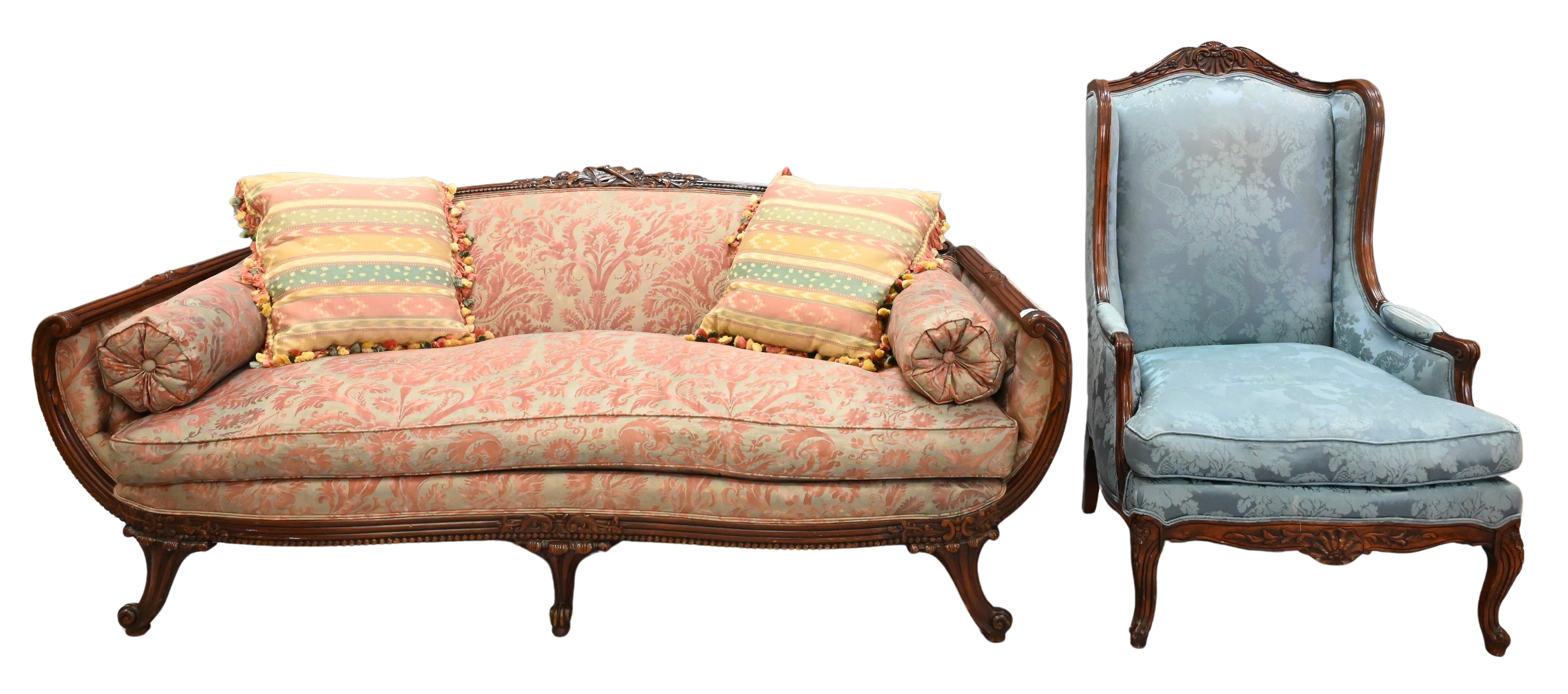 to include carved mahogany frame sofa with curving arms and cabriole legs along with Fortuny upholstered wing chair