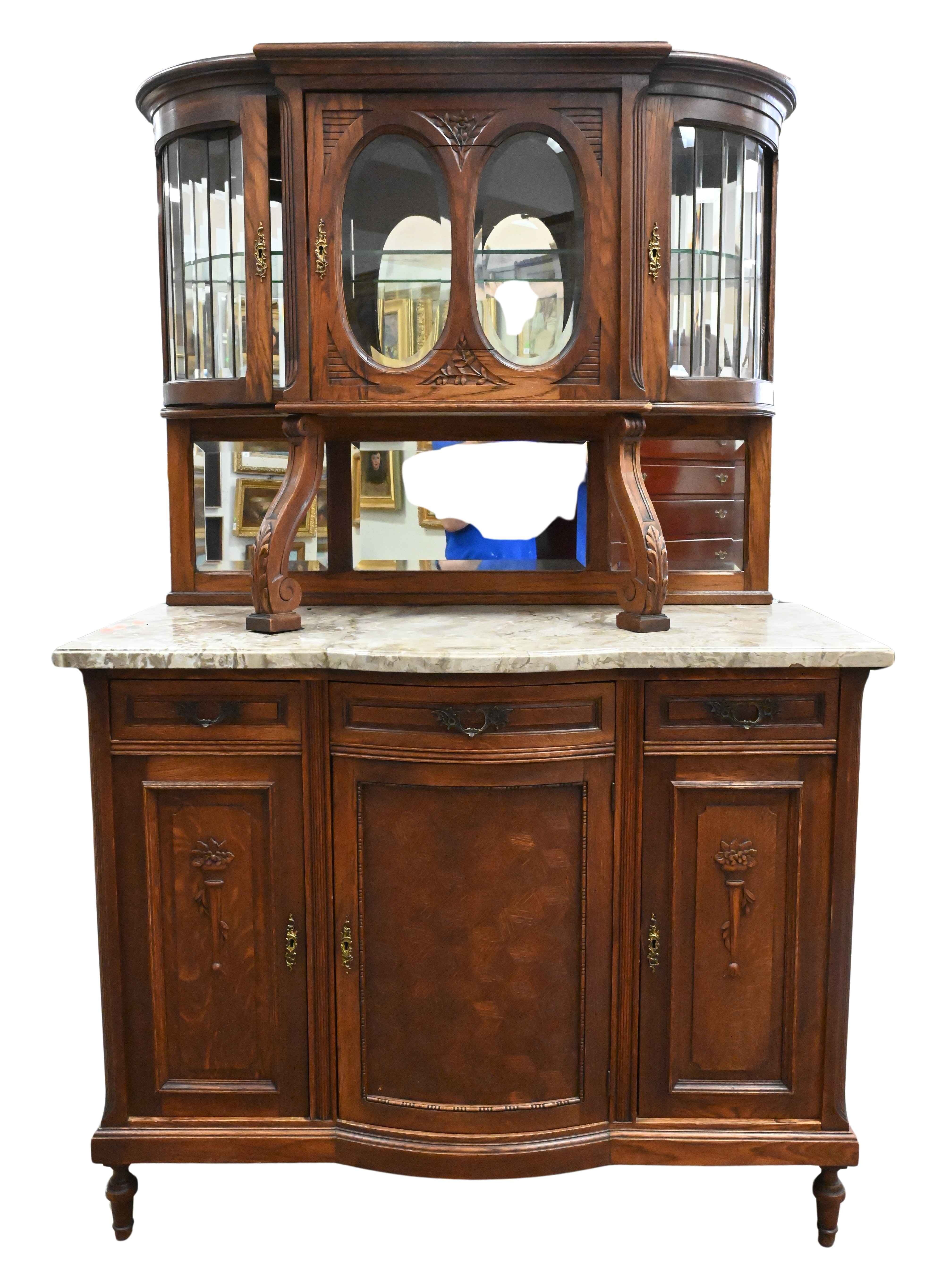 having three glass doors over three drawers with mirrored back over three marquetry doors, one door pushed in please see photos