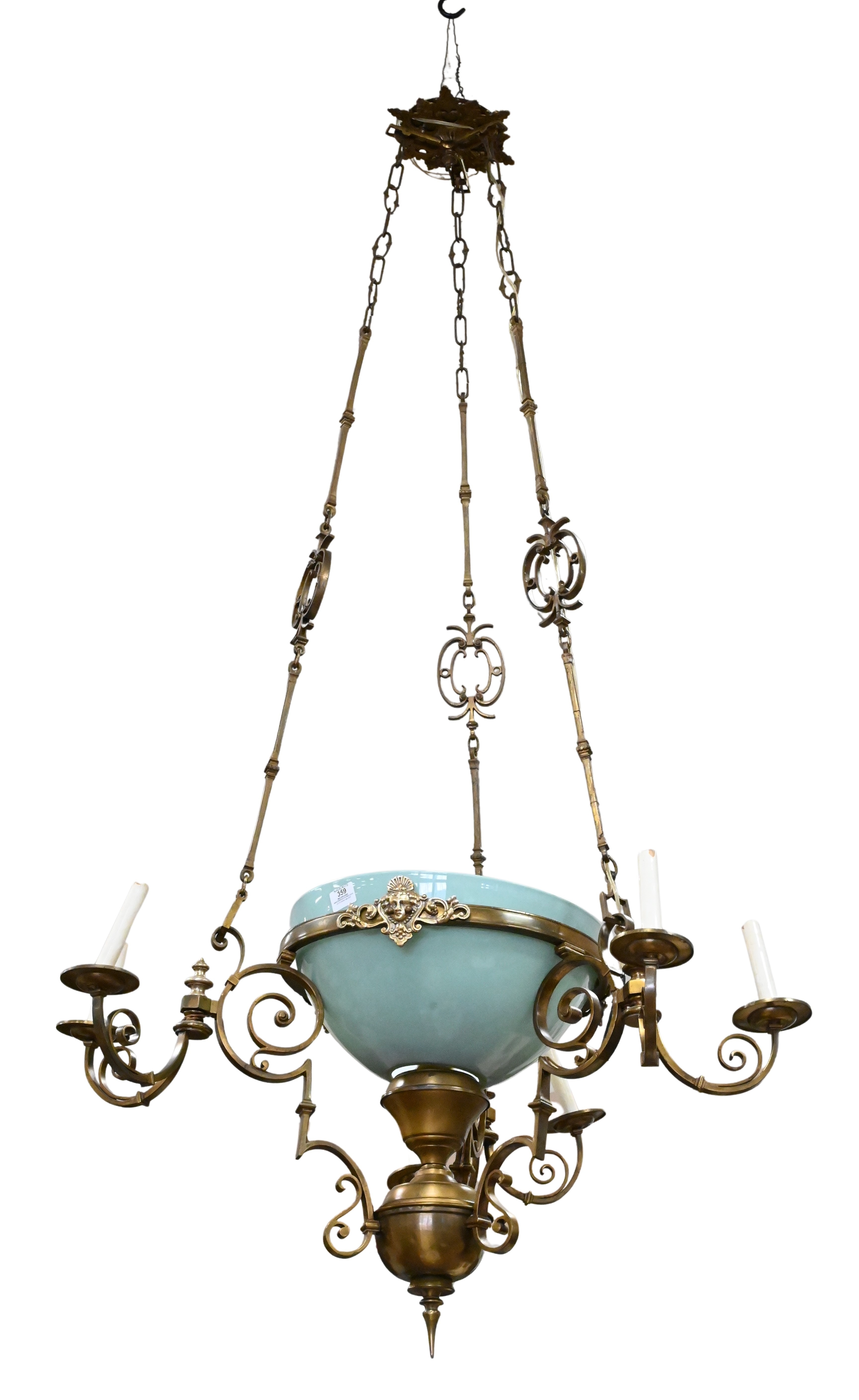 French Brass and Glass Seven Light Oil Lamp Chandelier