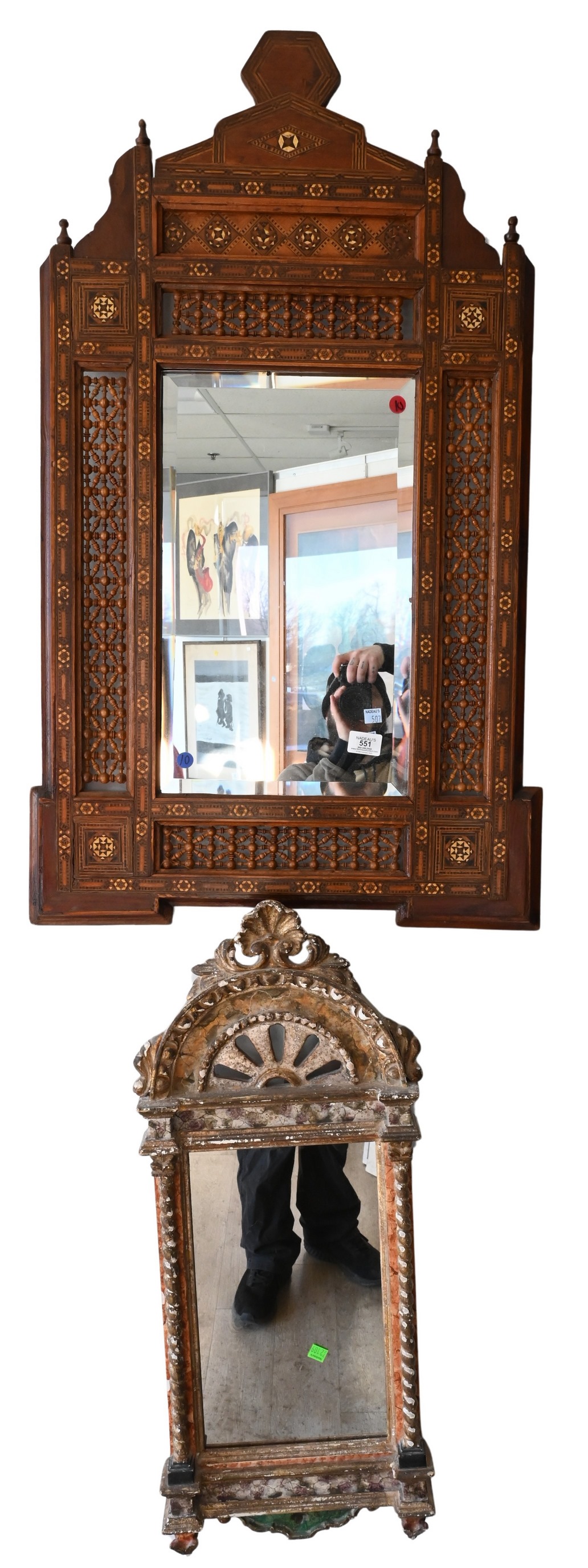 Moroccan carved and inlaid mirror with ball and fretwork, along with a polychrome carved mirror having faux marble paint and column borders