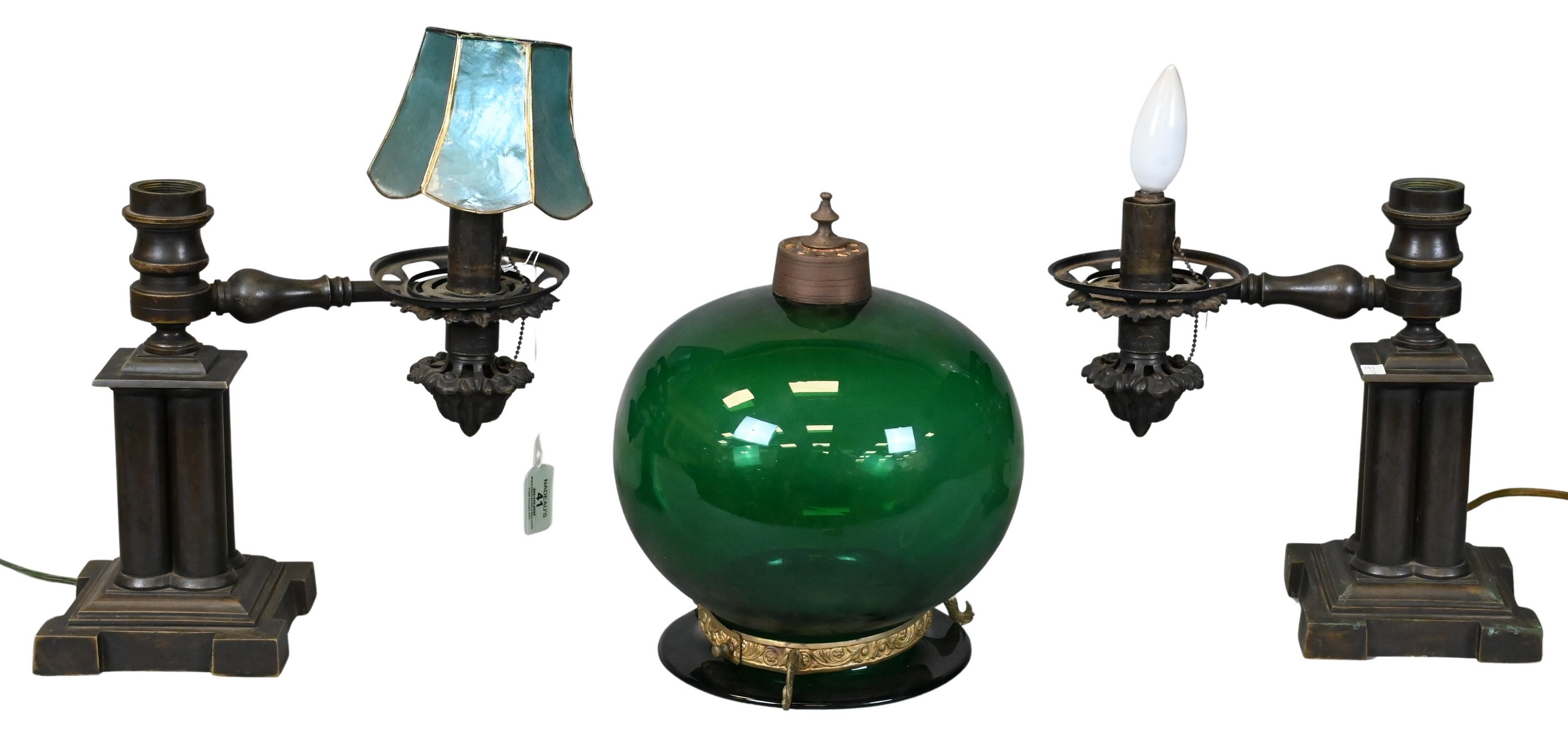 pair of American bronze argand lamps along with a emerald green glass hanging light shade