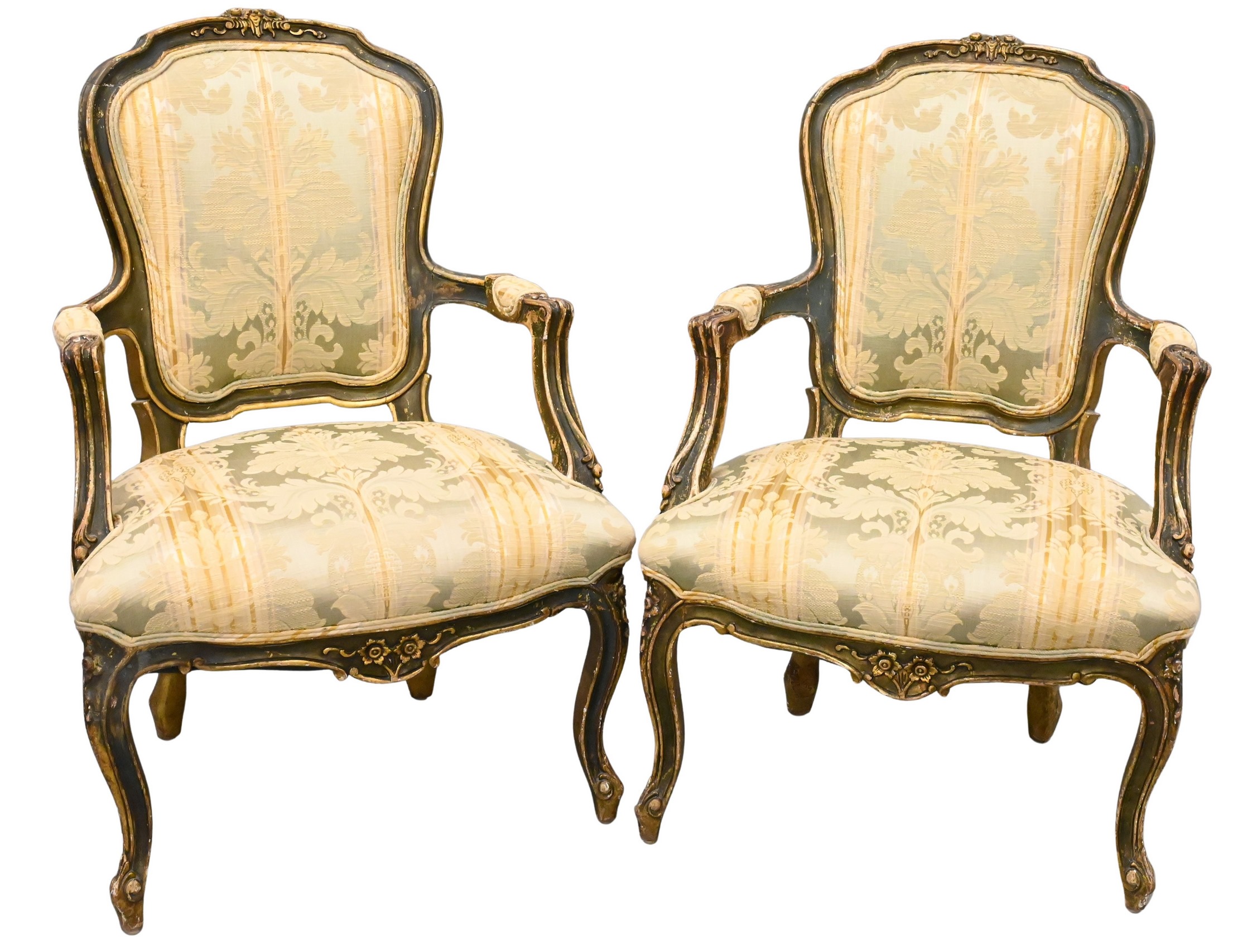 two armchairs and four side chairs having rounded backs (upholstery not all matching)