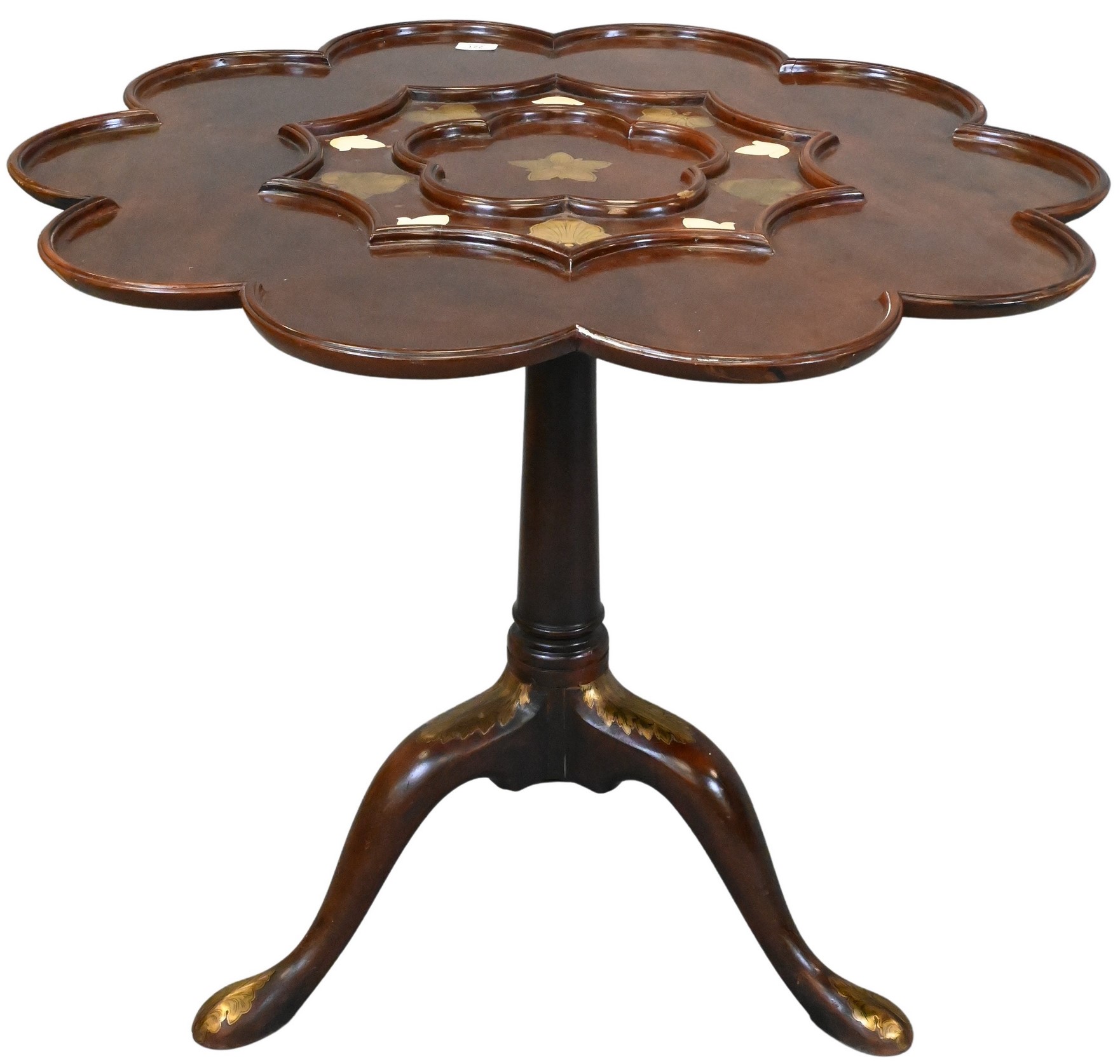 having molded shaped edge and sections with brass inlays on pedestal ending in tripod base, mounted with brass knees and feet