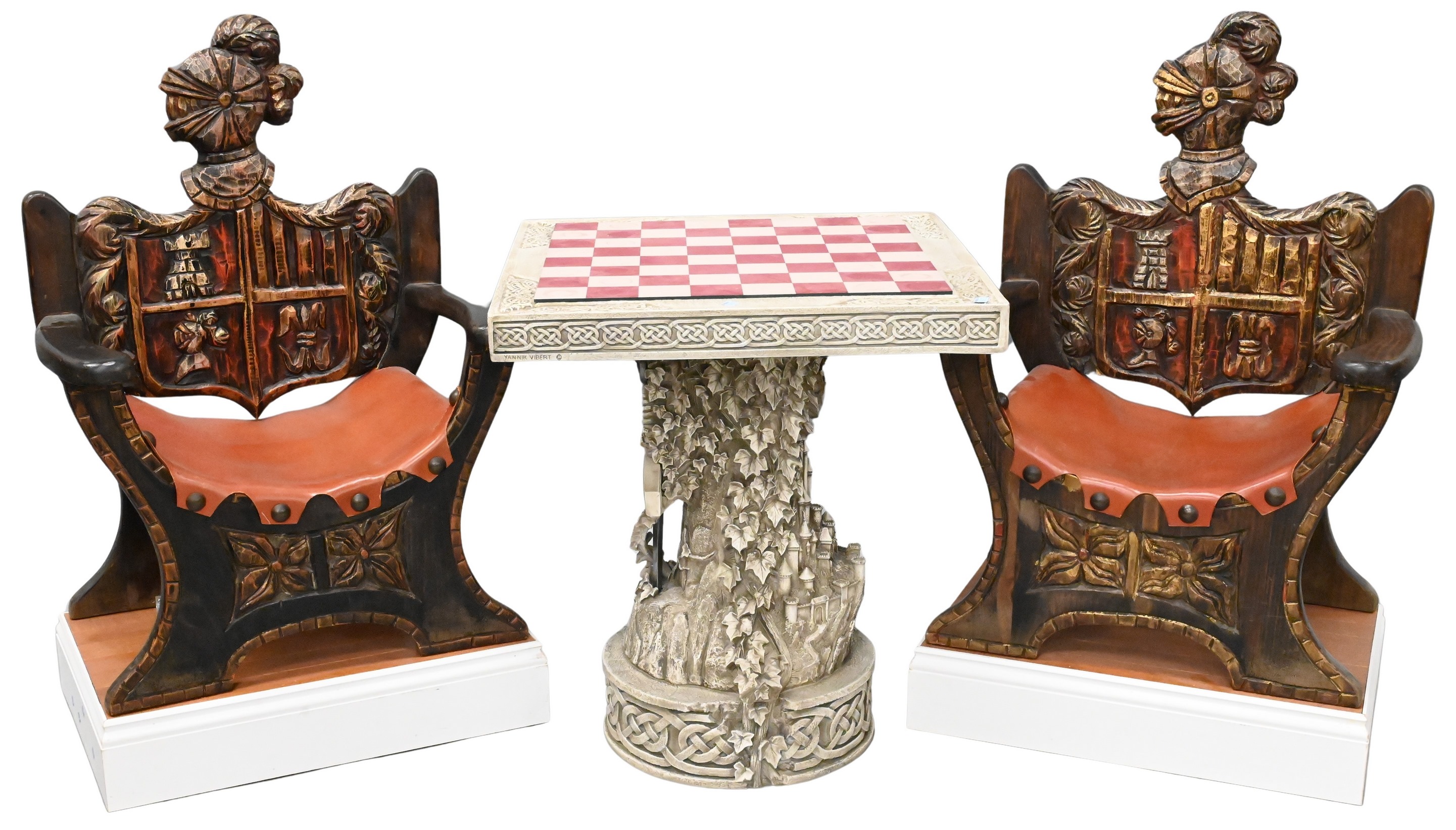 to include custom chess board / table having carved base along with two carved armchairs each set on platforms having castors, complete with chess pieces