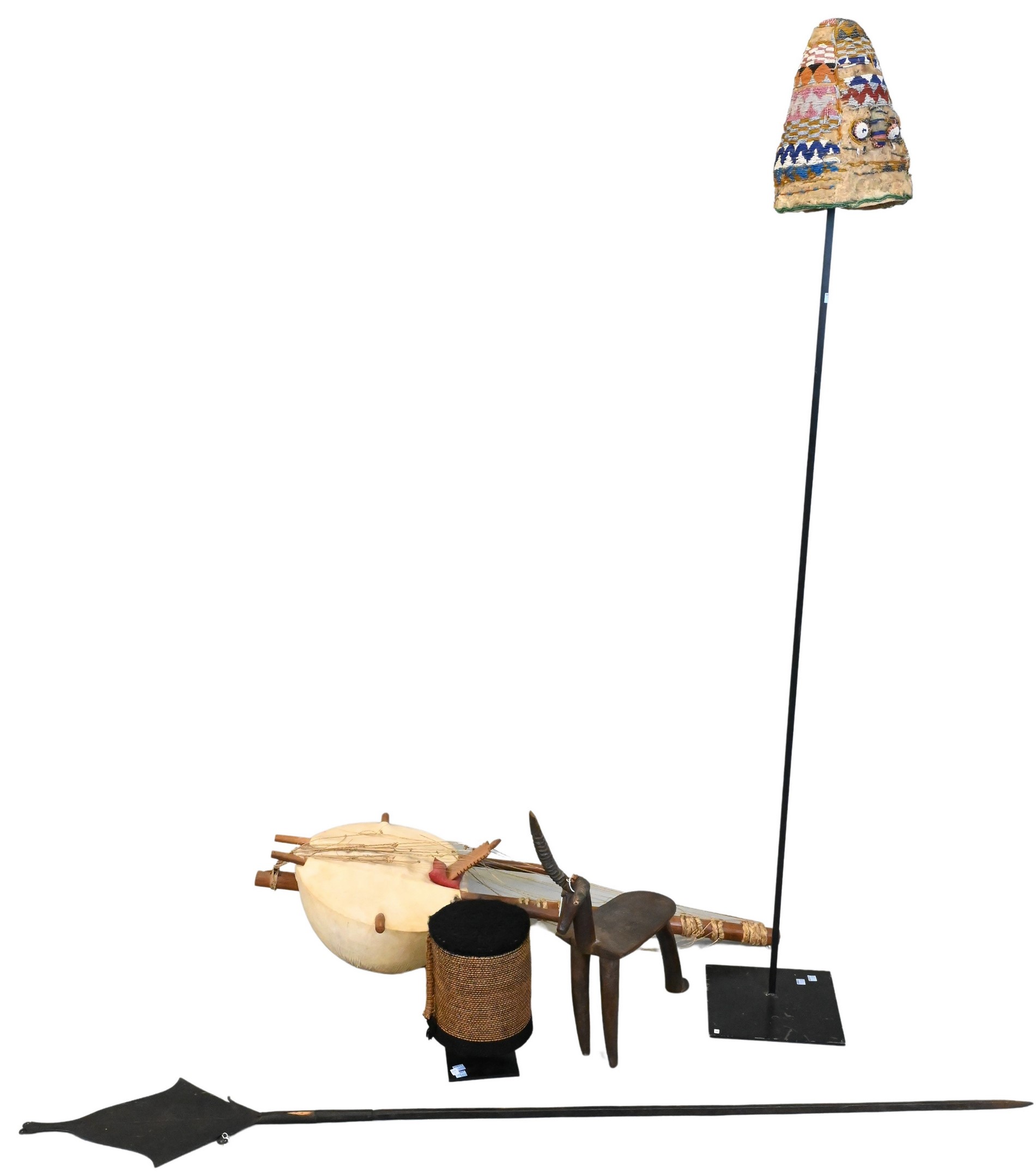 to include metal longspear having detailed finial circa 1890, Senufo string instrument made of wood, hide, and string