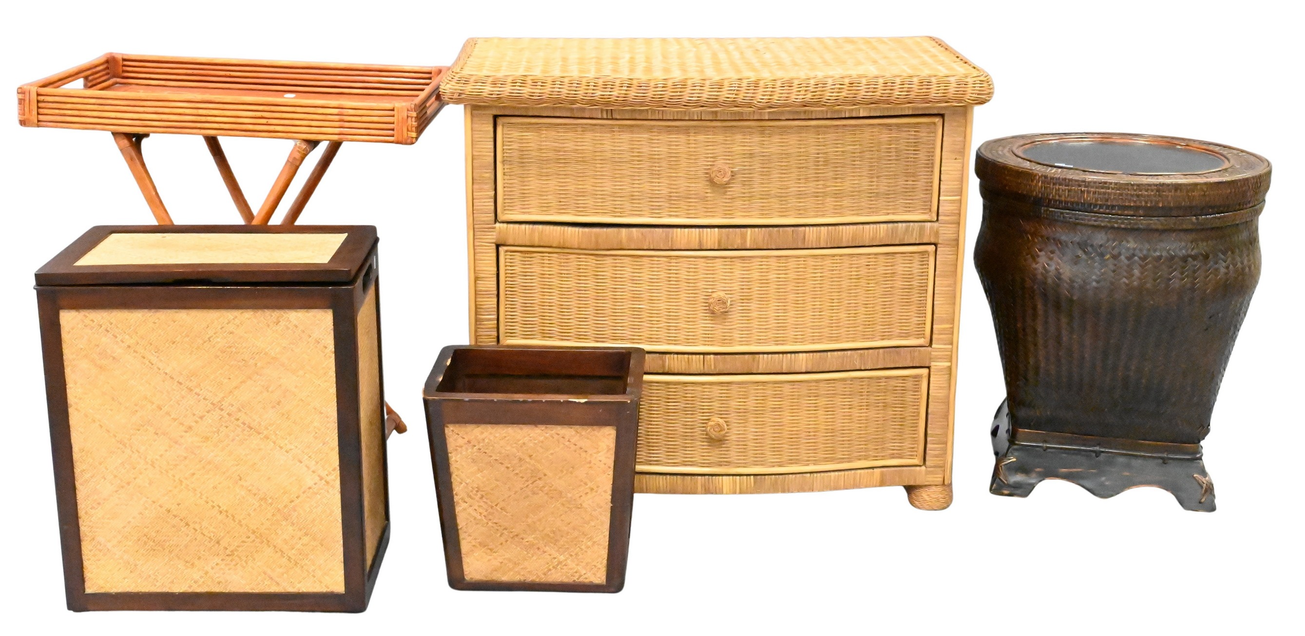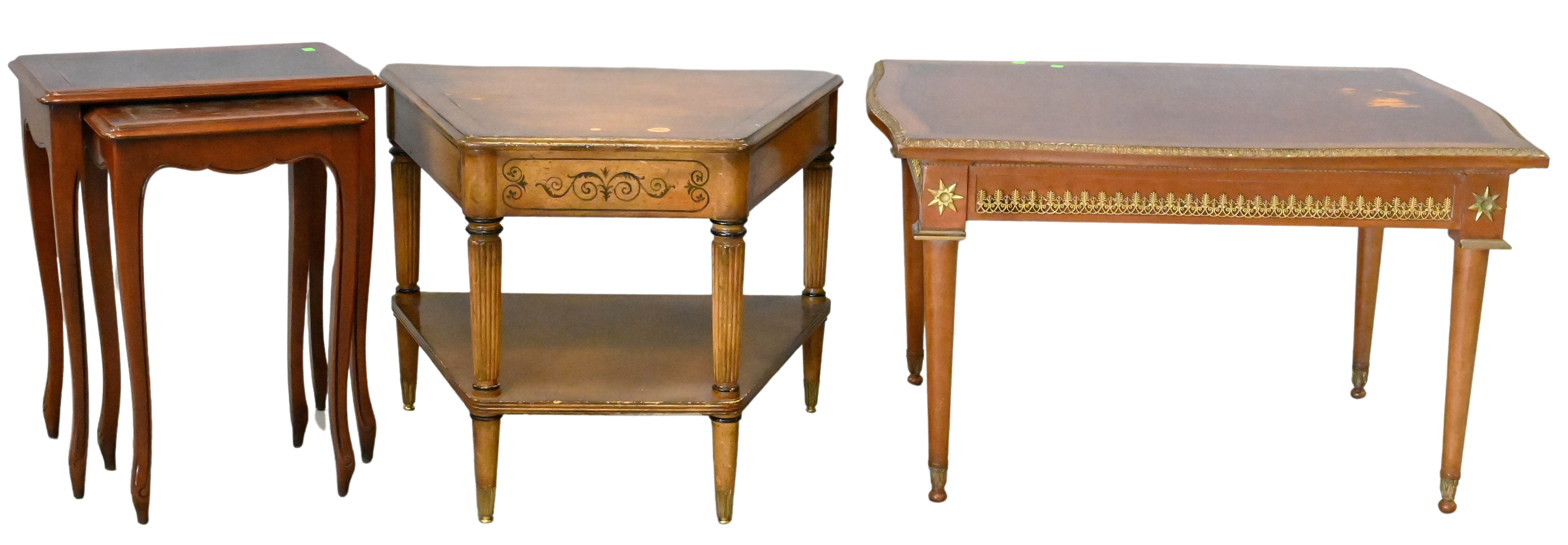 to include a pair of leather stacking tables, a gilt decorative table having shaped top, along with an inlaid table