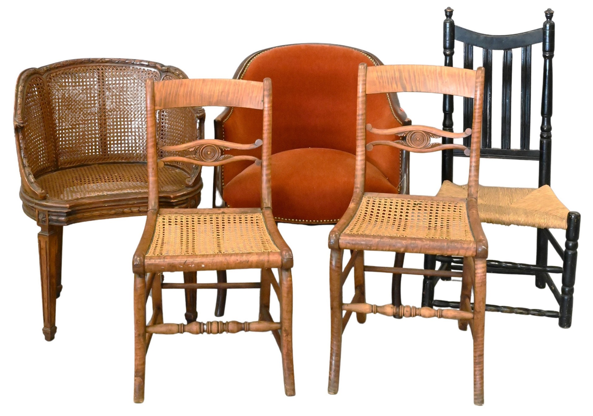to include pair of federal tiger maple side chairs having caned seats, children’s armchair, French caned chair, upholstered armchair, and a bannister back side chair