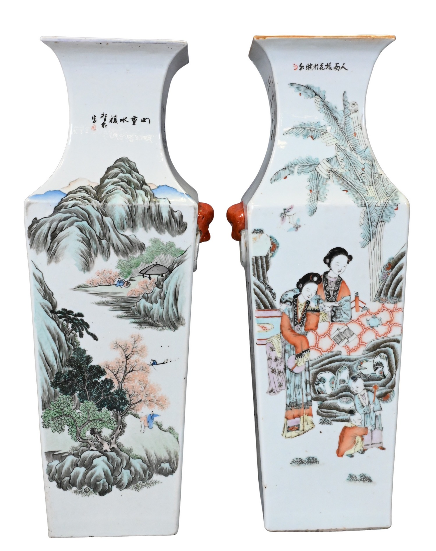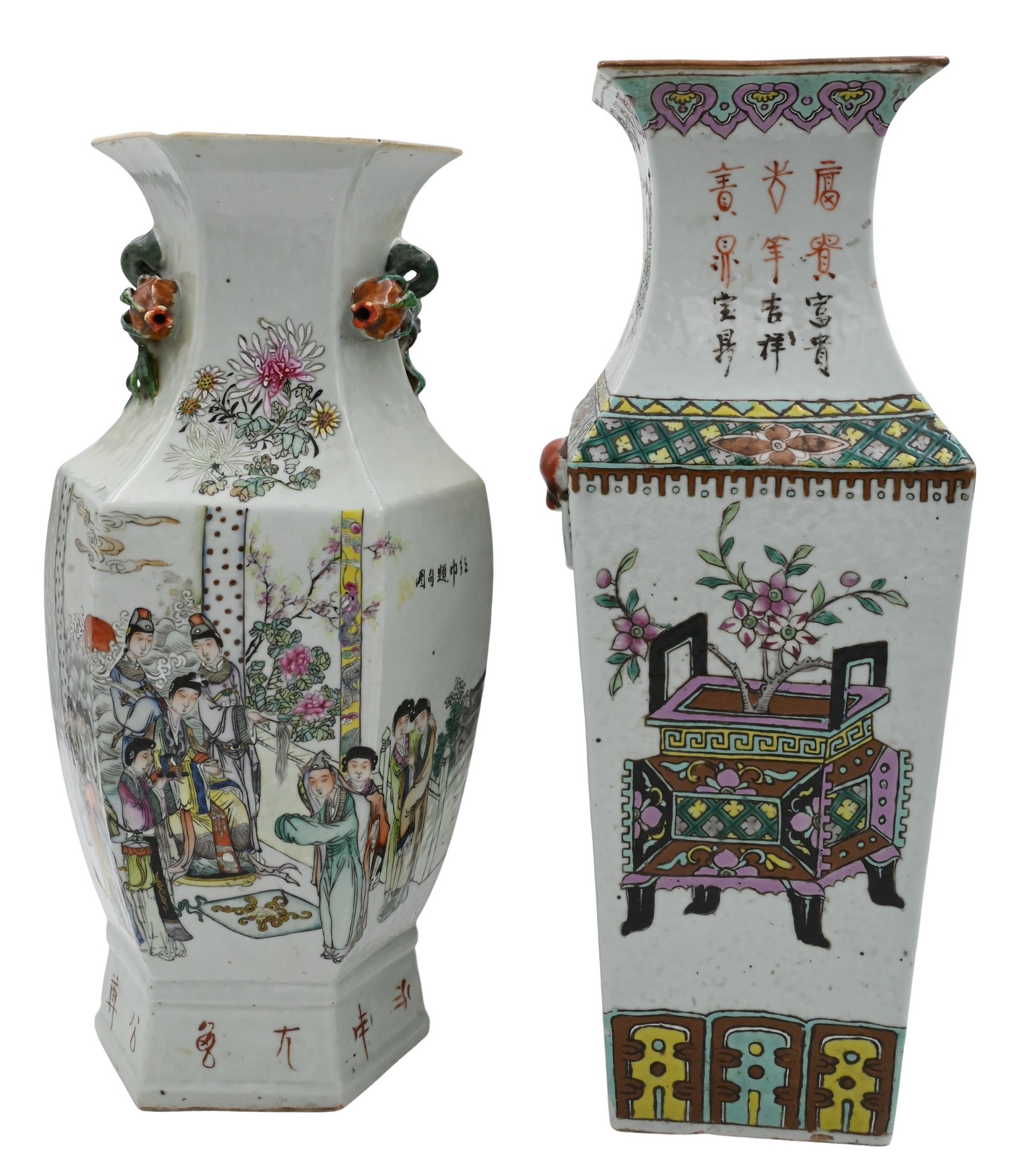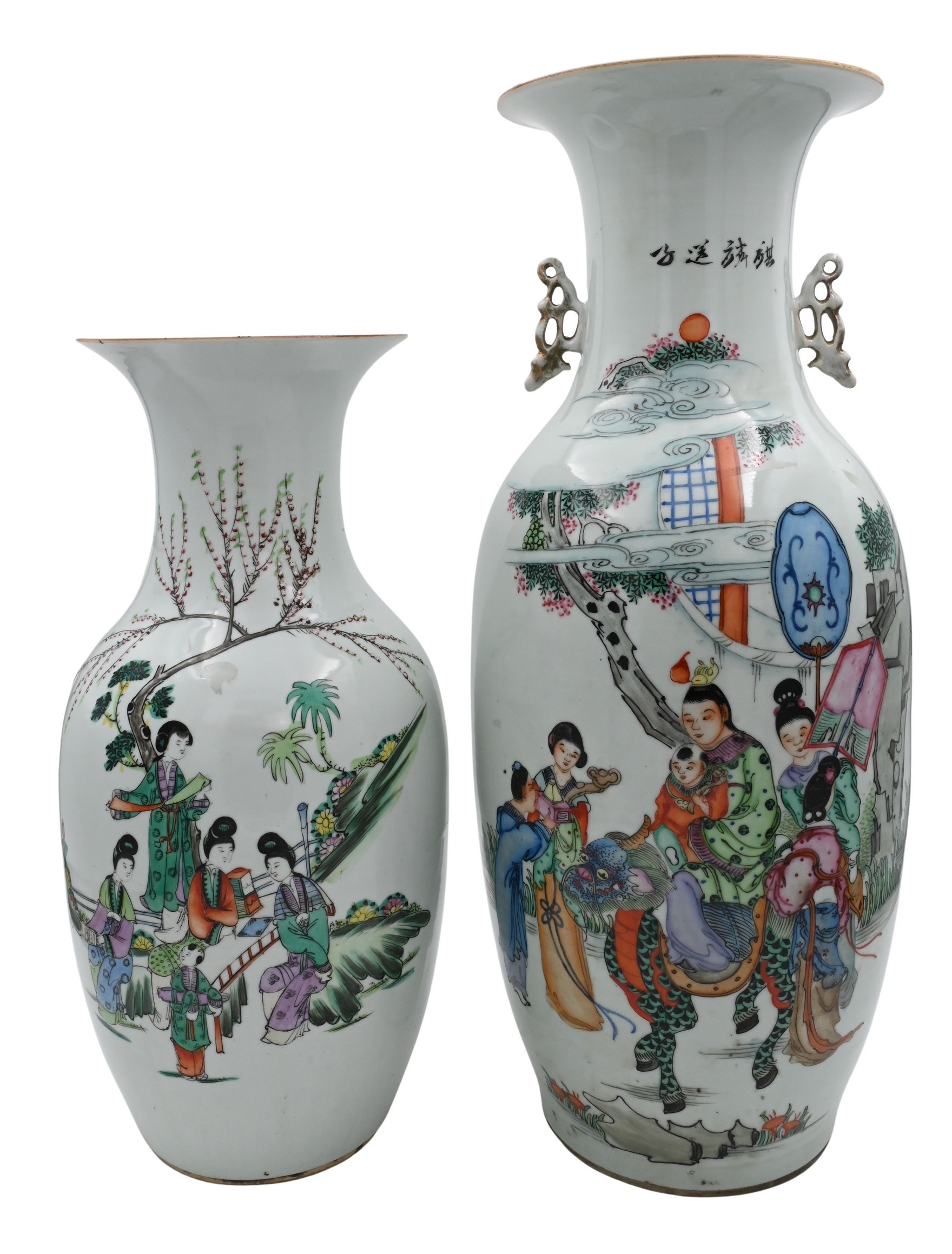 to include famille rose leisure garden scene vase with double handles featuring geishas in a courtyard along with vase having garden scene with scholars