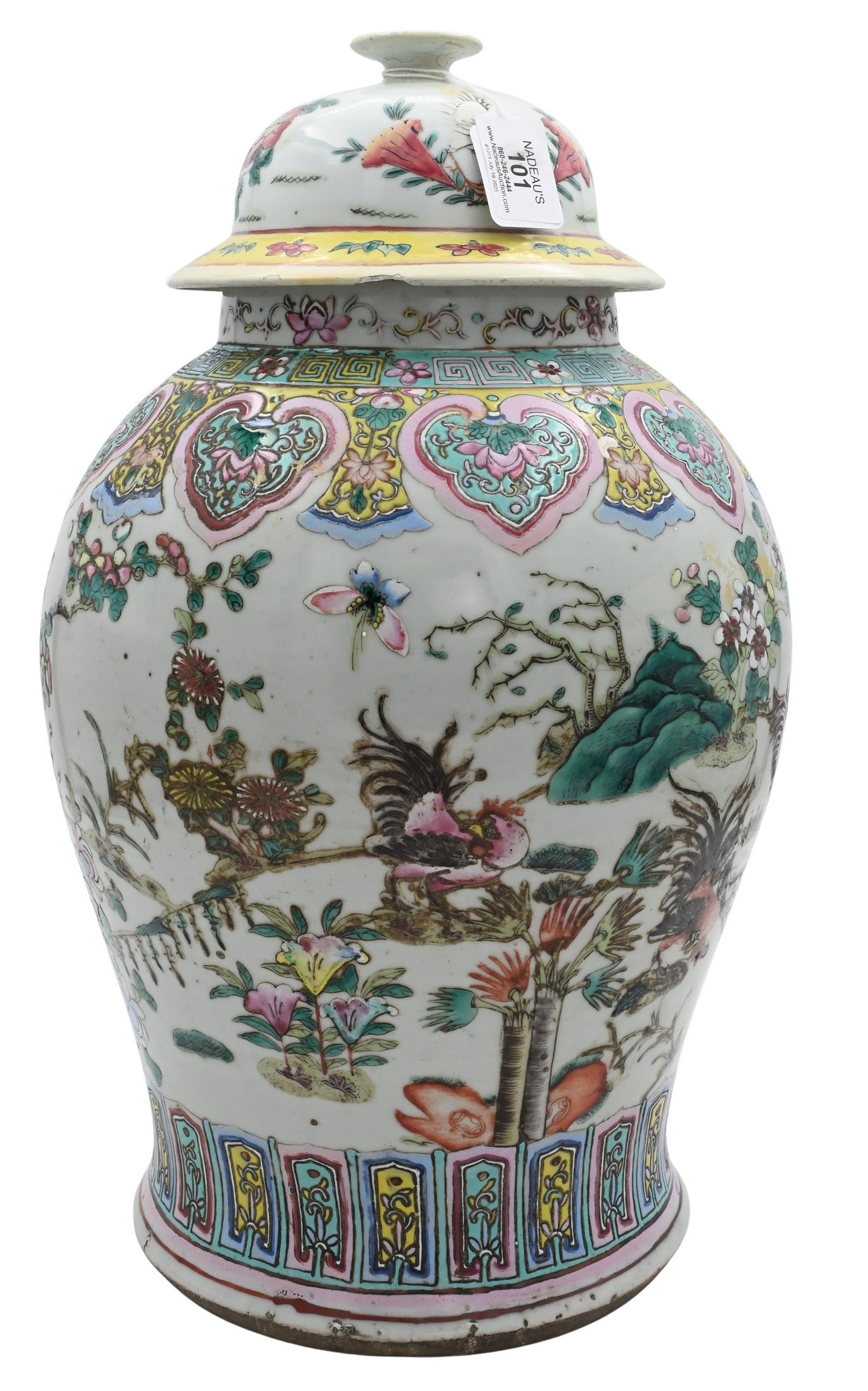 lidded ginger jar featuring enameled chickens in a landscape with cherry blossoms