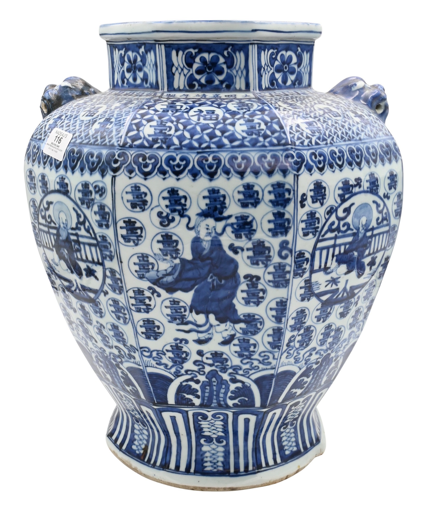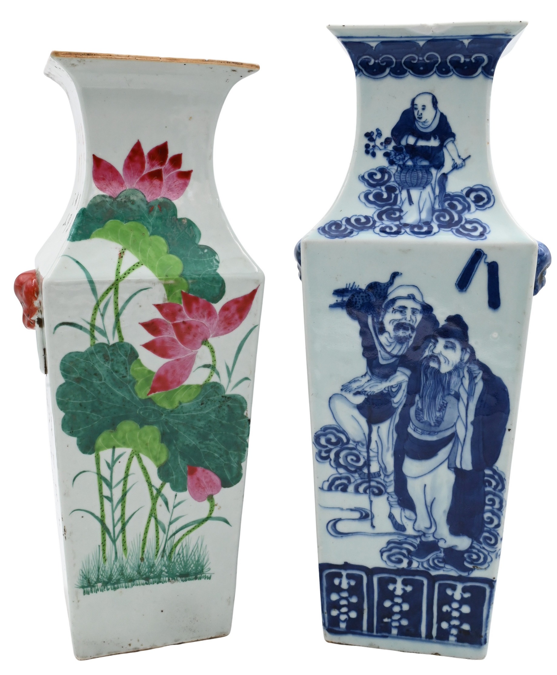 to include blue and white vase having eight immortals or scholar motif amongst clouds along with famille rose lotus flower vase, both having flared necks and double foo dog handle knockers