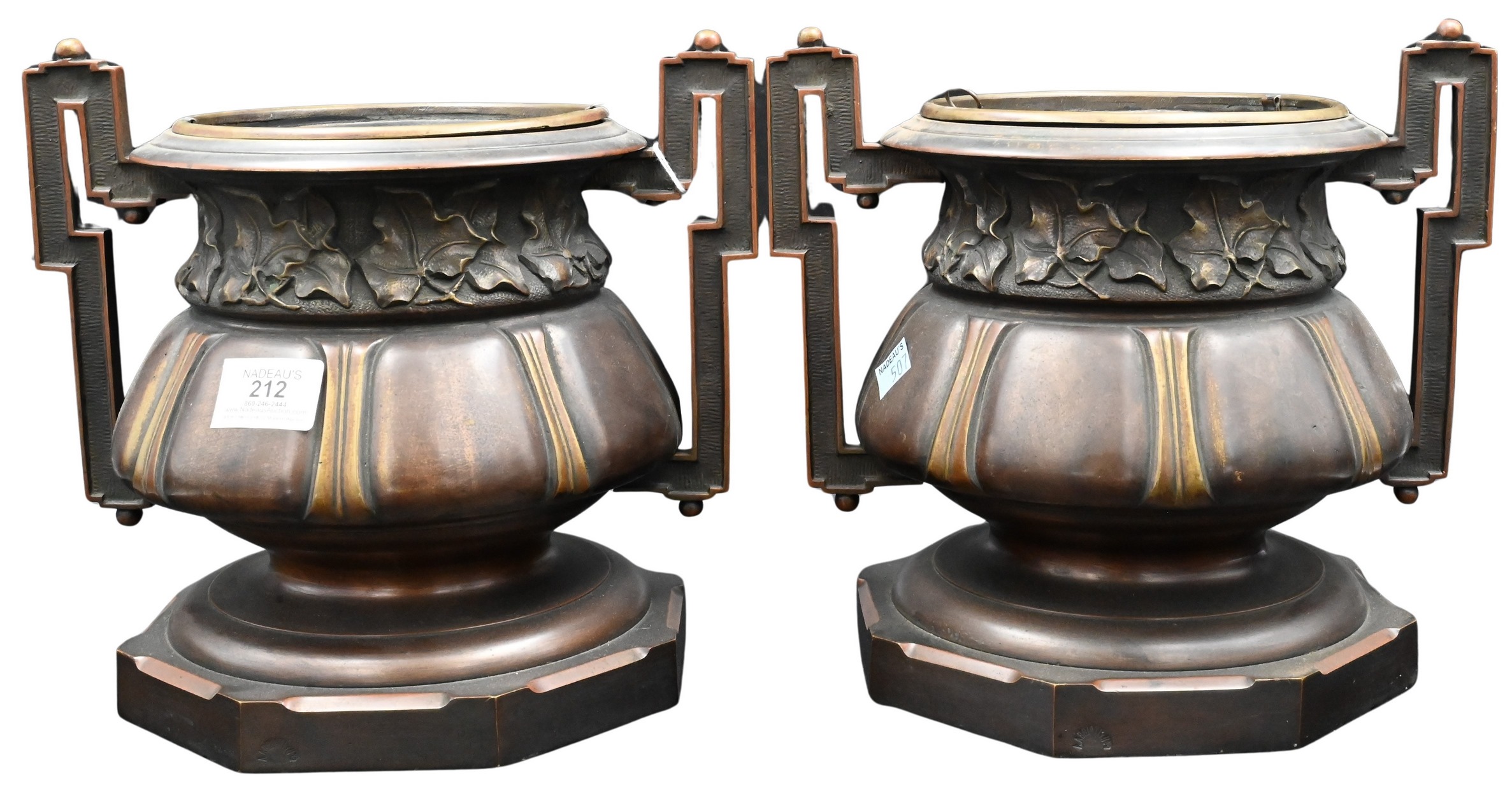 to include one square form vase having double foo dog knocker handles with enameled ritual vessel motif, the other having raised rose form handles with flower and Geisha motif