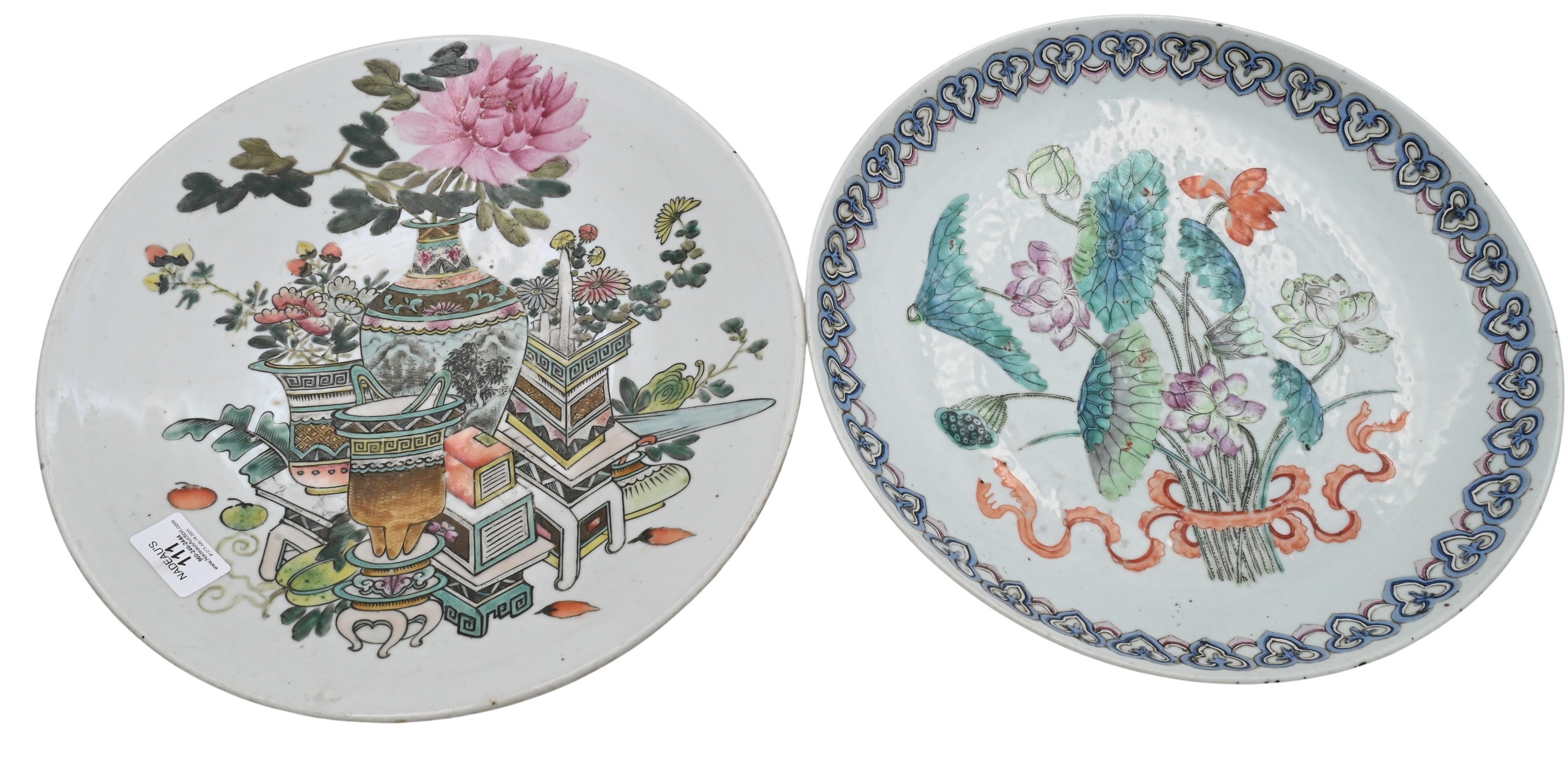 to include on having flower and urn “Antique” mofit marked on underside and the other a Japanese plate featuring an enamel bouquet of lotus flowers