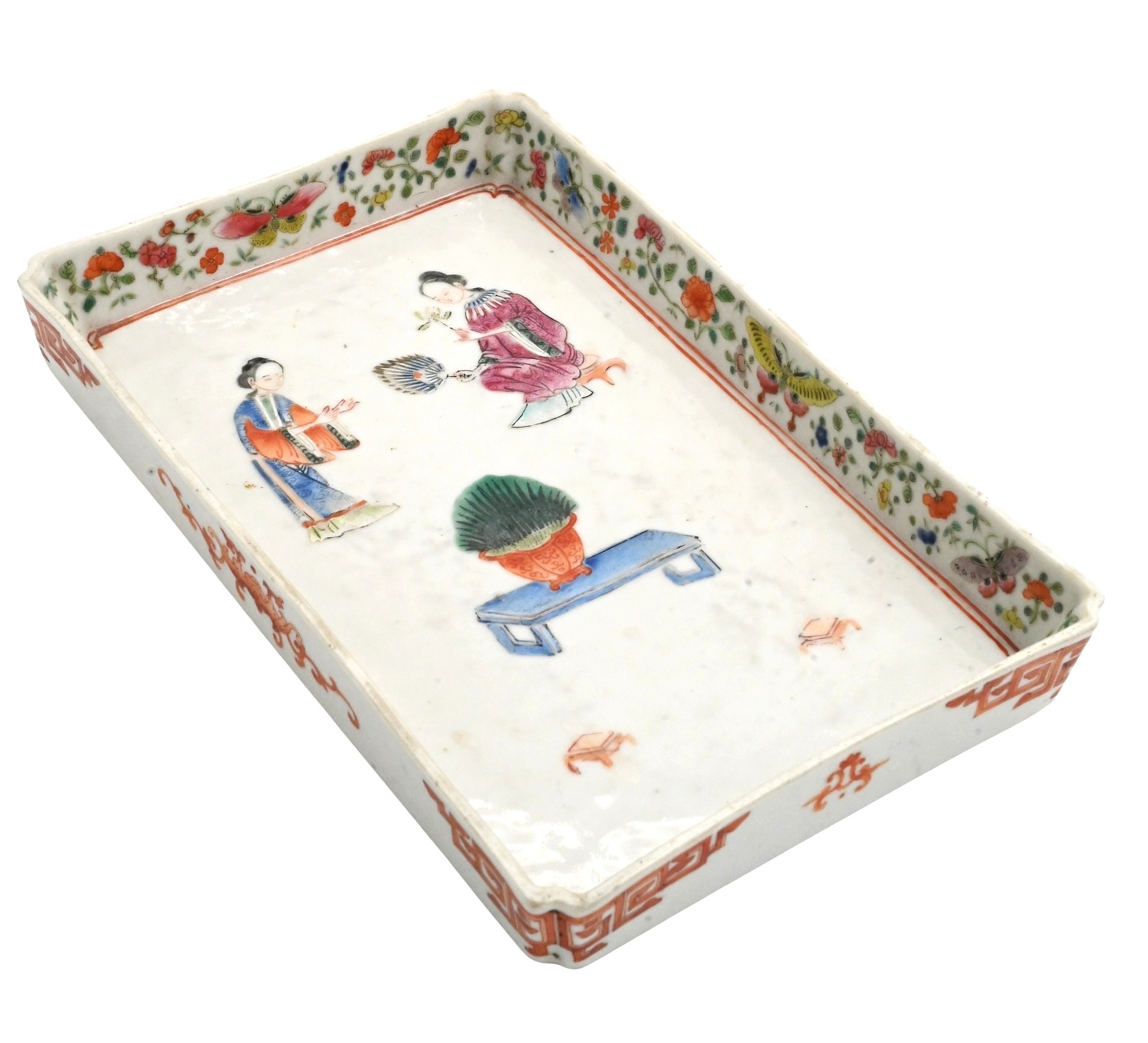 of rectangular form raised on four shaped feet, center depicting two Geishas, one woman with fan, the other bowing beside a potted plant on a bench bordered by butterfly and flower motif, exterior geometric design in iron red