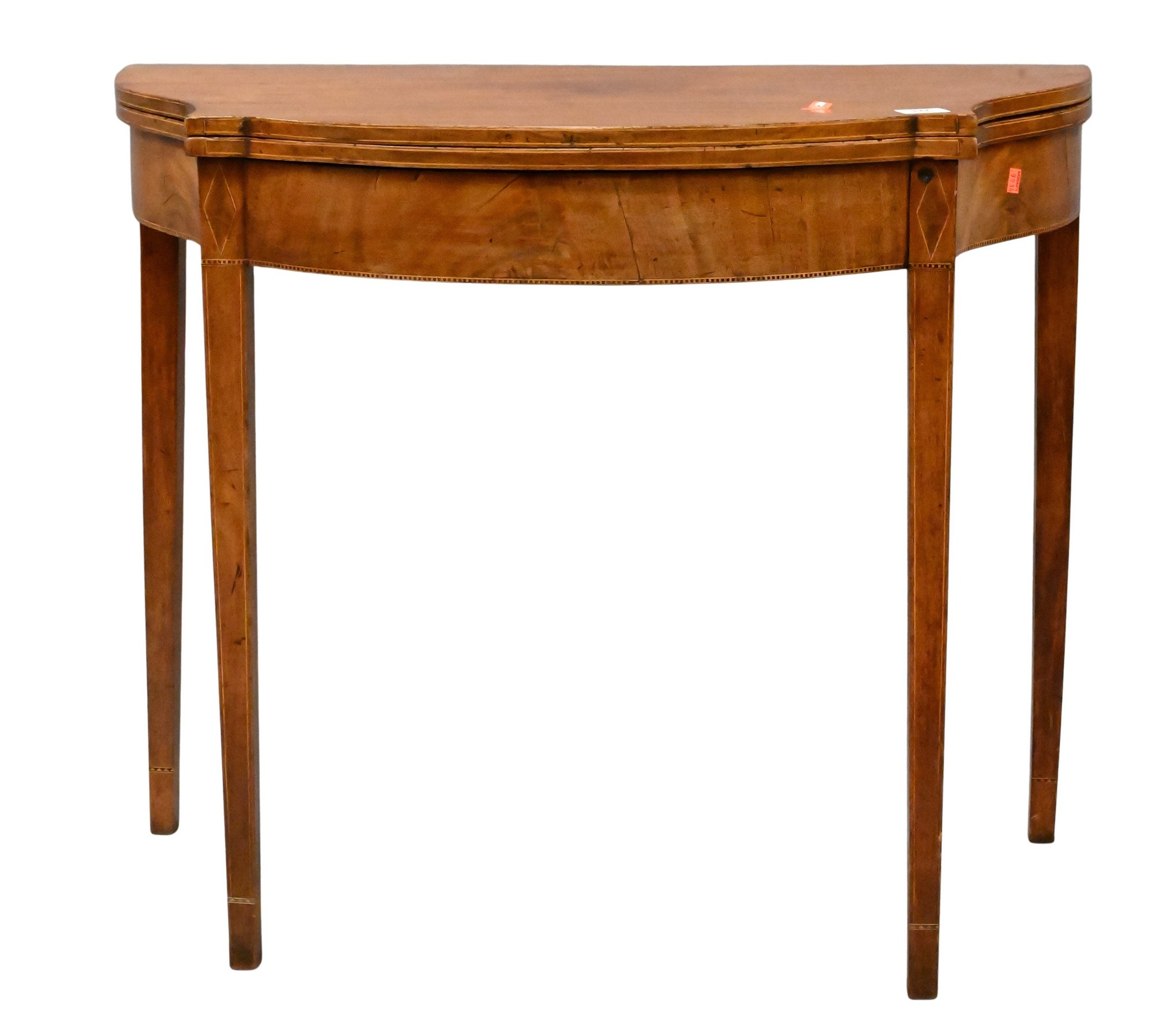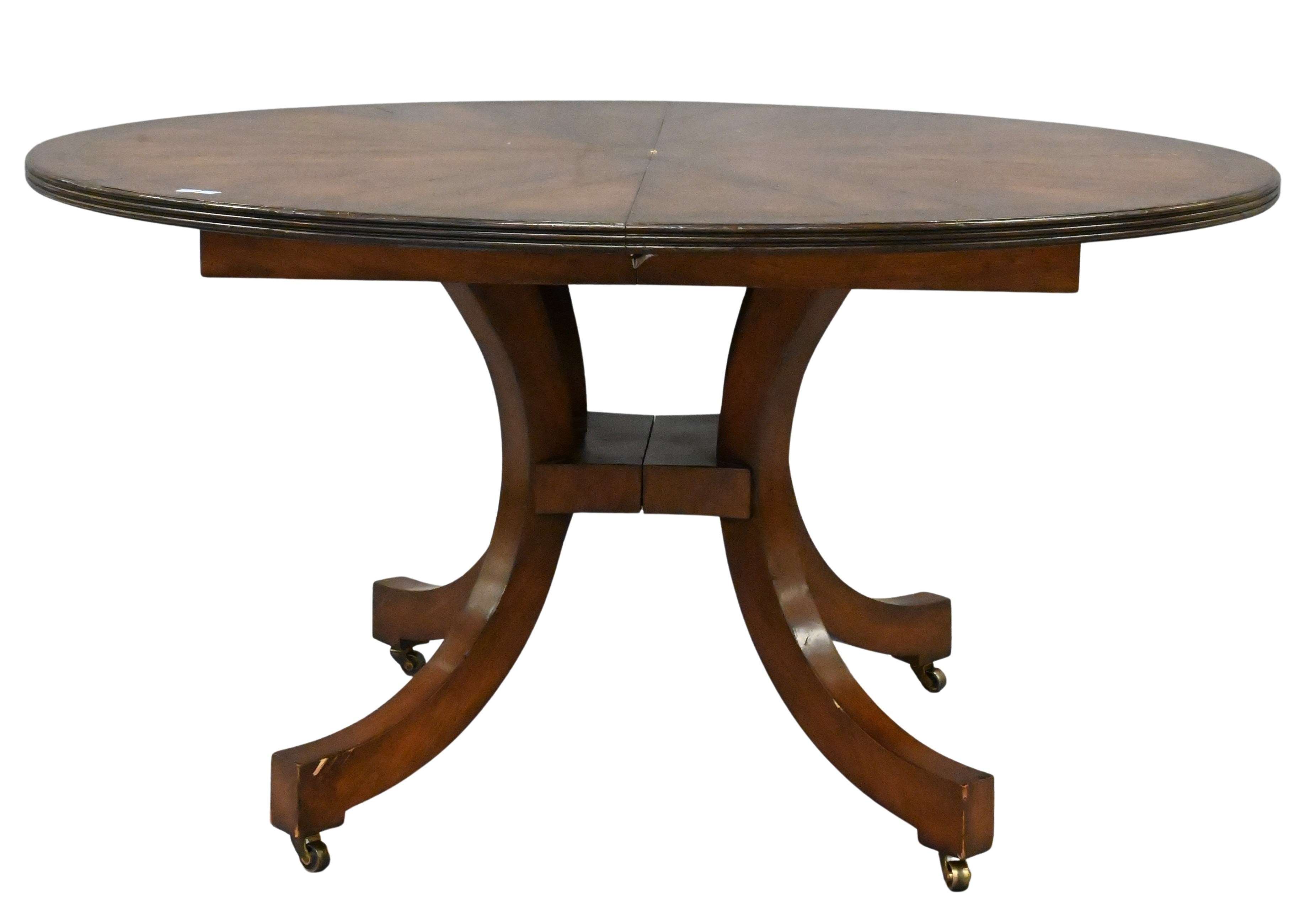 having inlaid brass center design bordered by band inlay set on four splayed legs ending in brass capped feet, with Watertown Co. metal extenders, 2 leaves 23 inches each