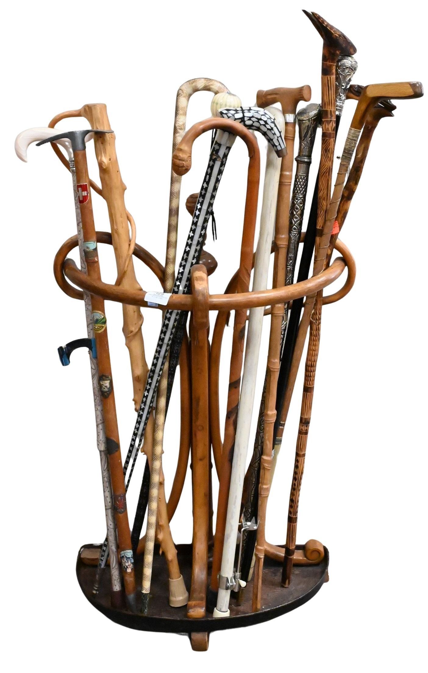 to include moroccan style inlaid, carved, snakeskin and figural canes, along with Abercrombie golf clubs in bentwood rack