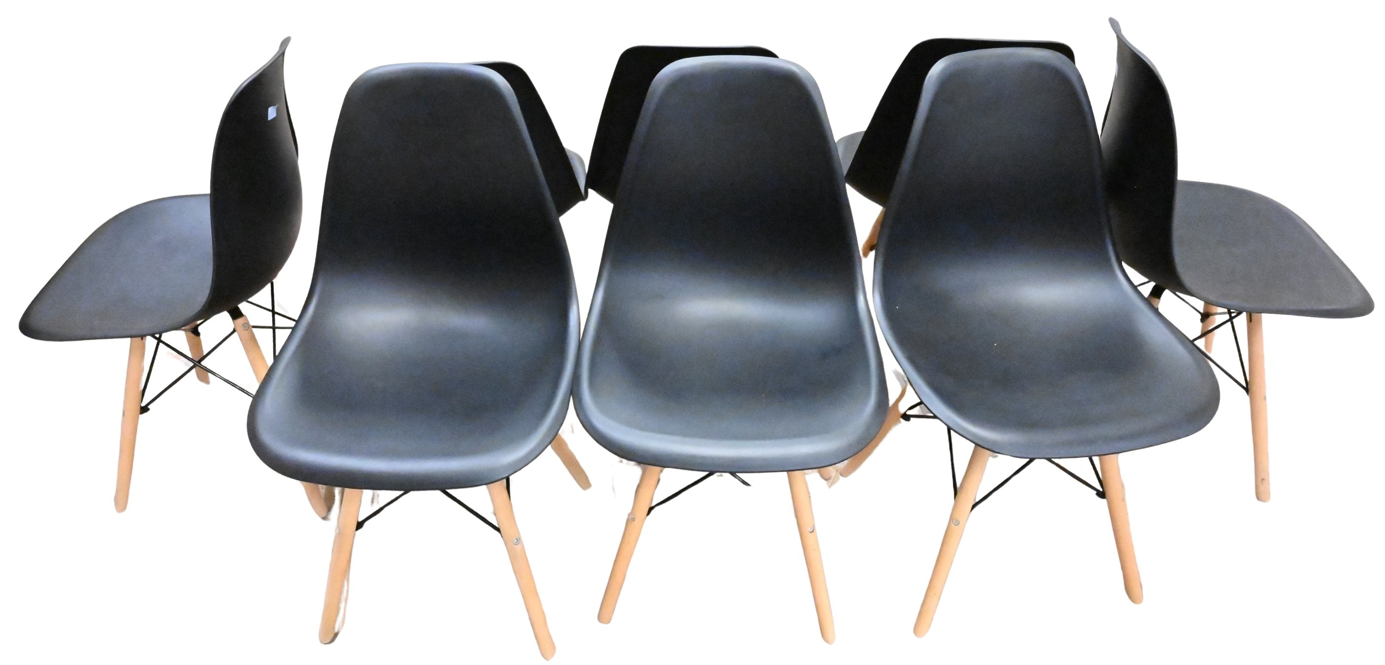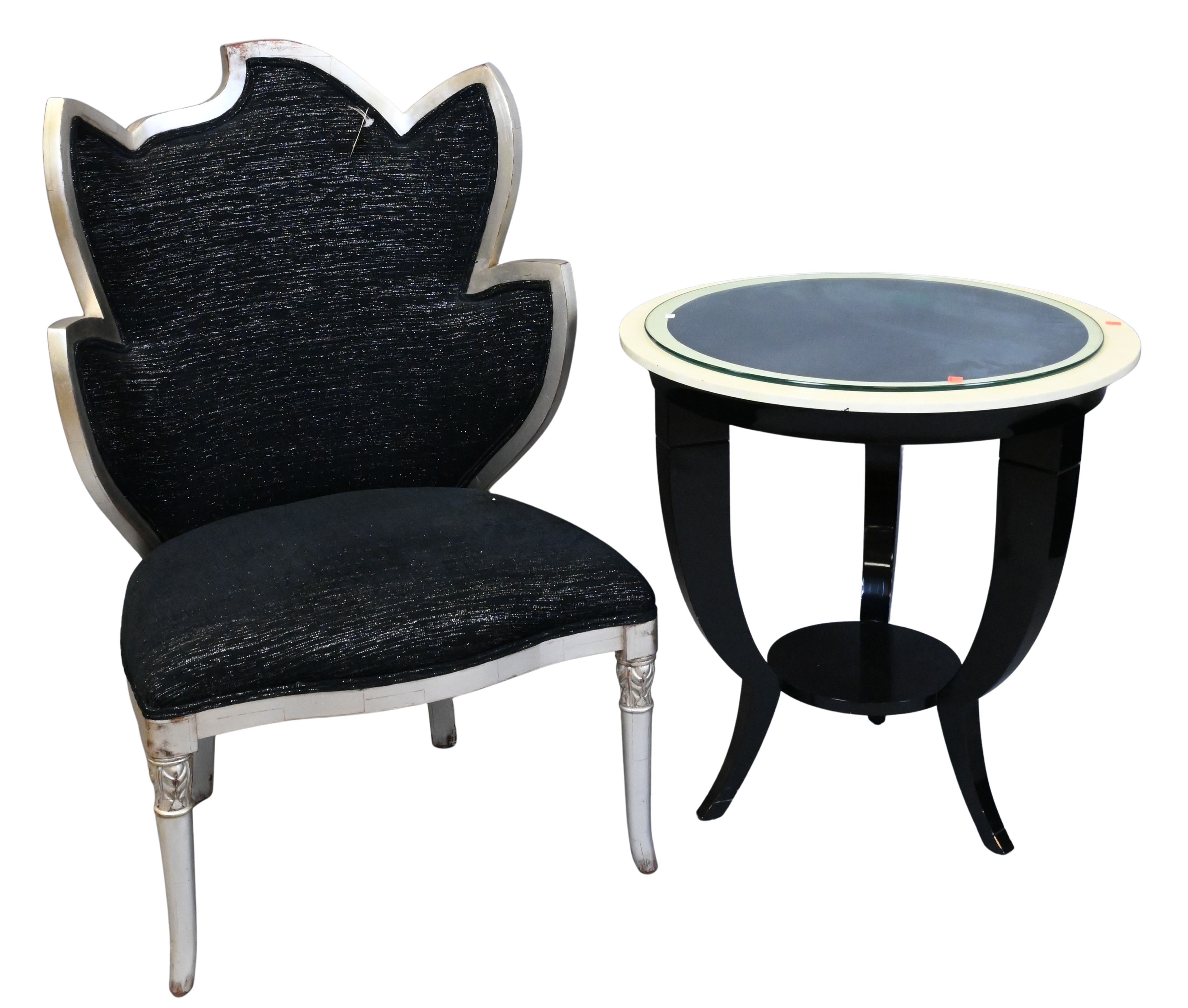 in custom black upholstery with shaped leaf form back over silver painted wood frame and flared legs, label on underside