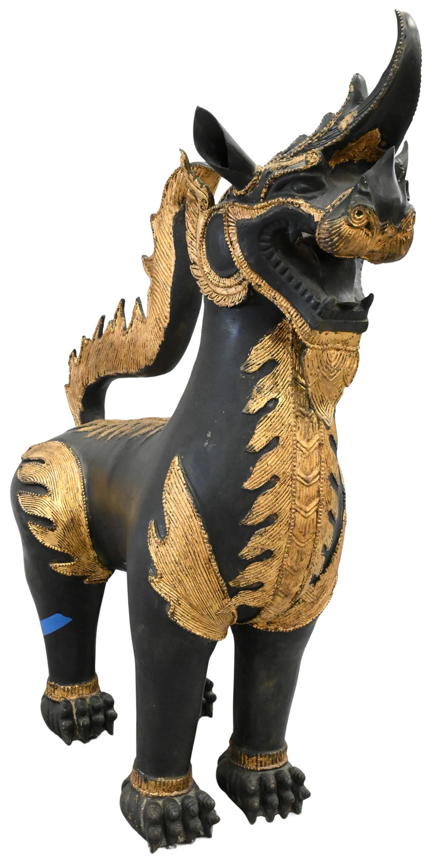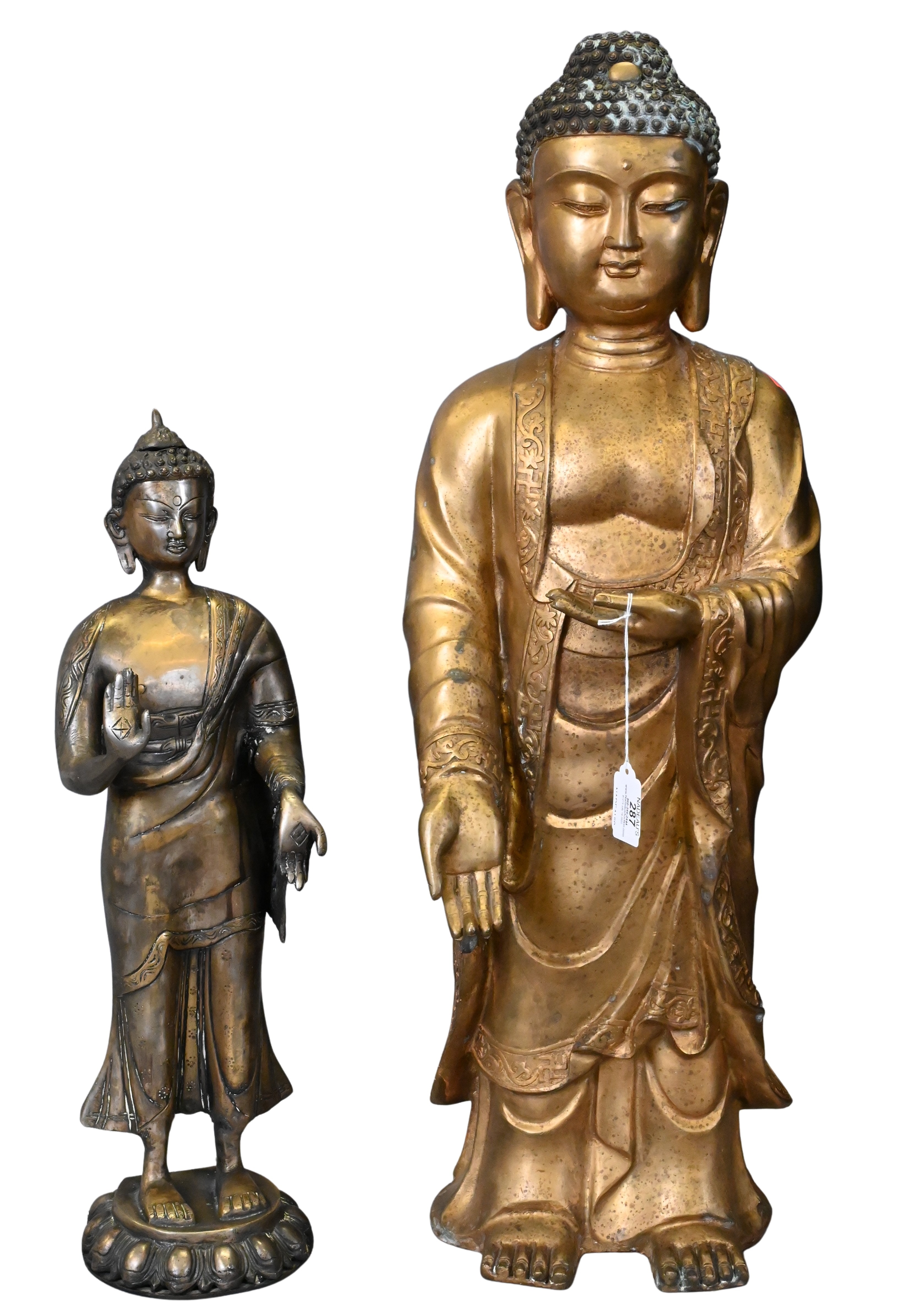 to include one gilt metal standing Buddha figure in East Asian fashion with gilt overlay, elongated earlobes and extended palm, the other also in East Asian fashion with elongated earlobes and extended hands in abhaya-mudra