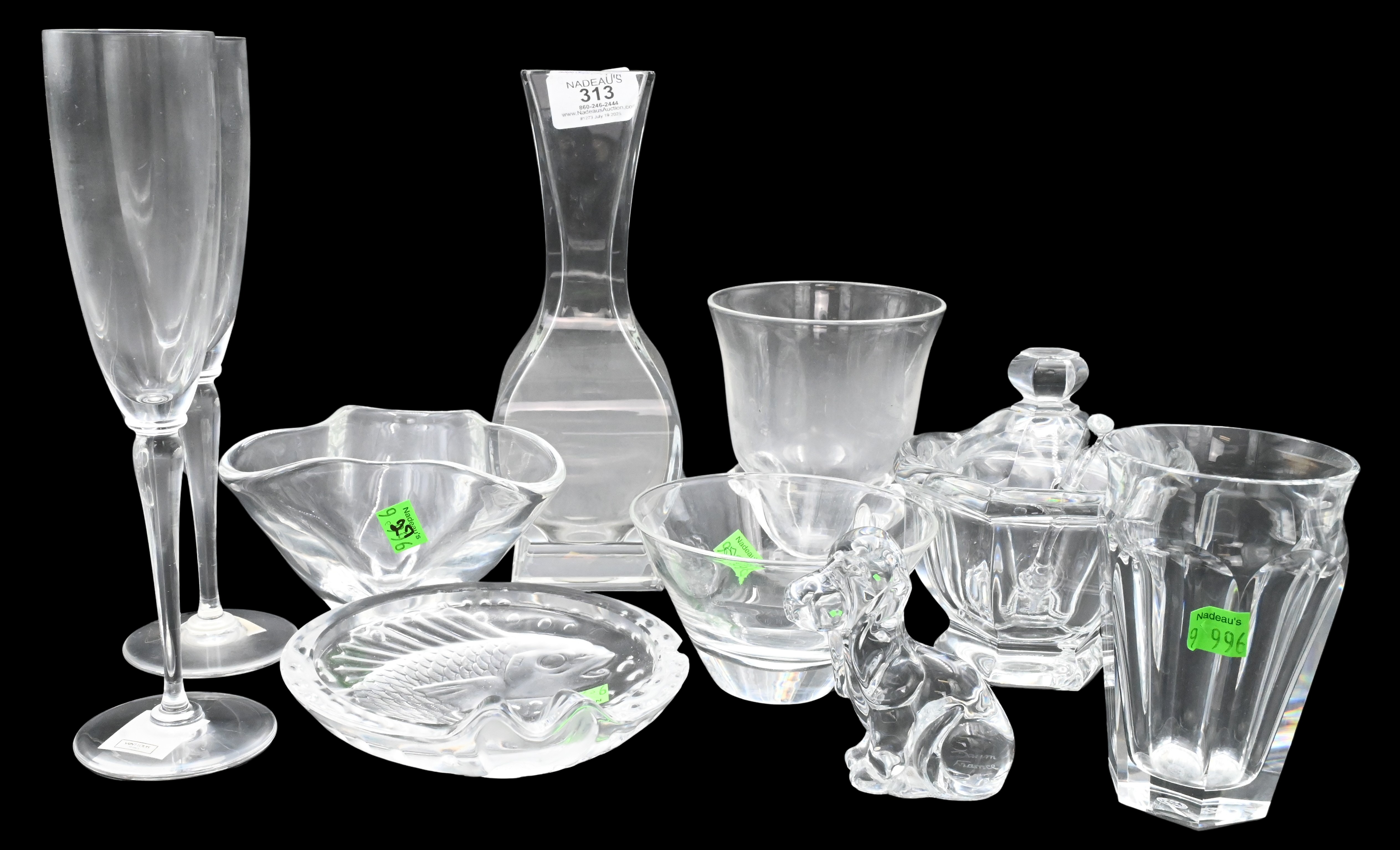 to include Baccarat vase, drinking glass, covered jar, Daum dog figure, three Steuben vases, Lalique carpe fish ashtray, along with pair of St. Louis champagne stems