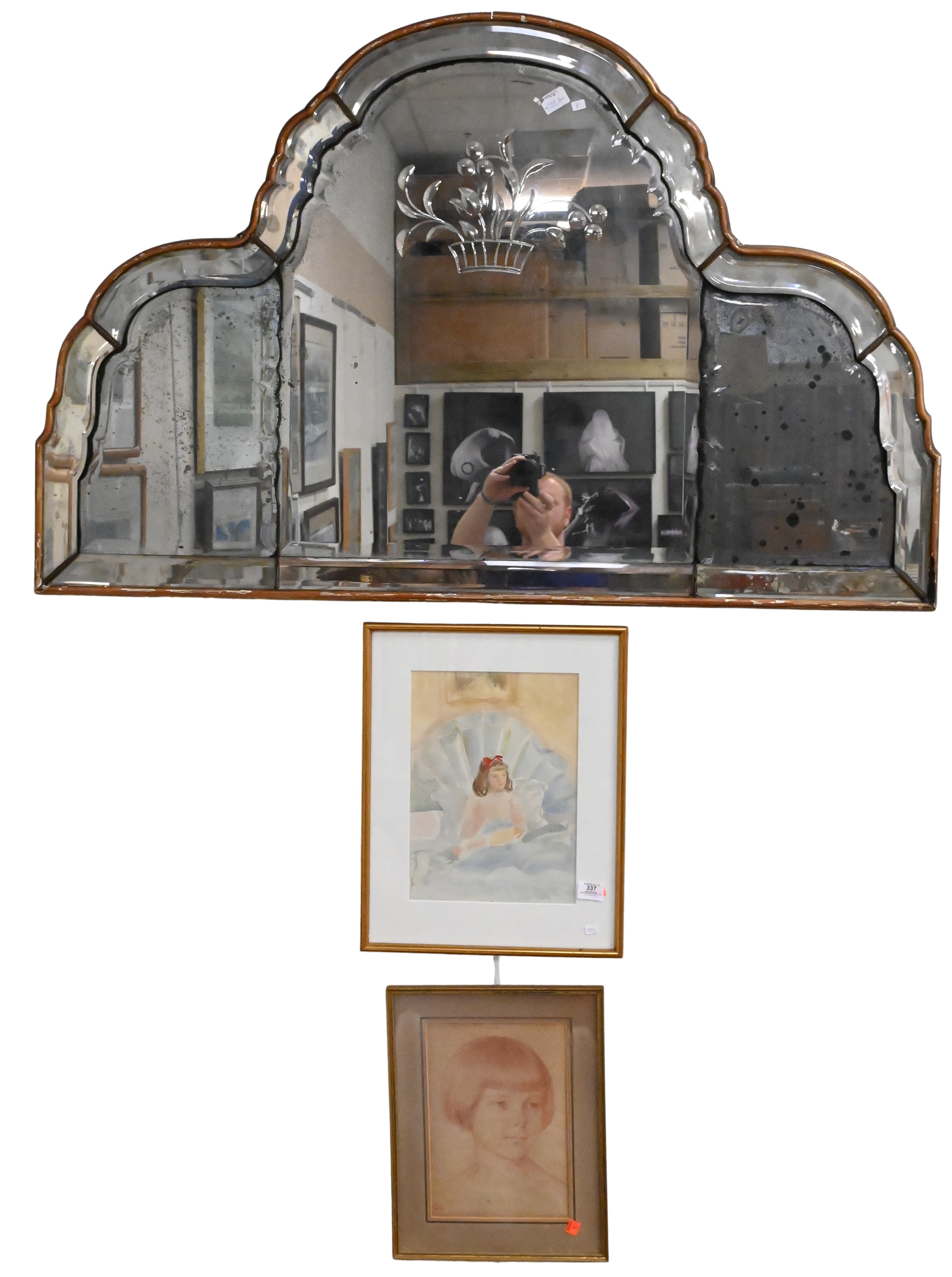 and a George II style three part over mantle mirror, center arched mirror having etched basket of flowers motif flanked by two smaller mirrors surrounded by beveled and paneled glass border within giltwood frame