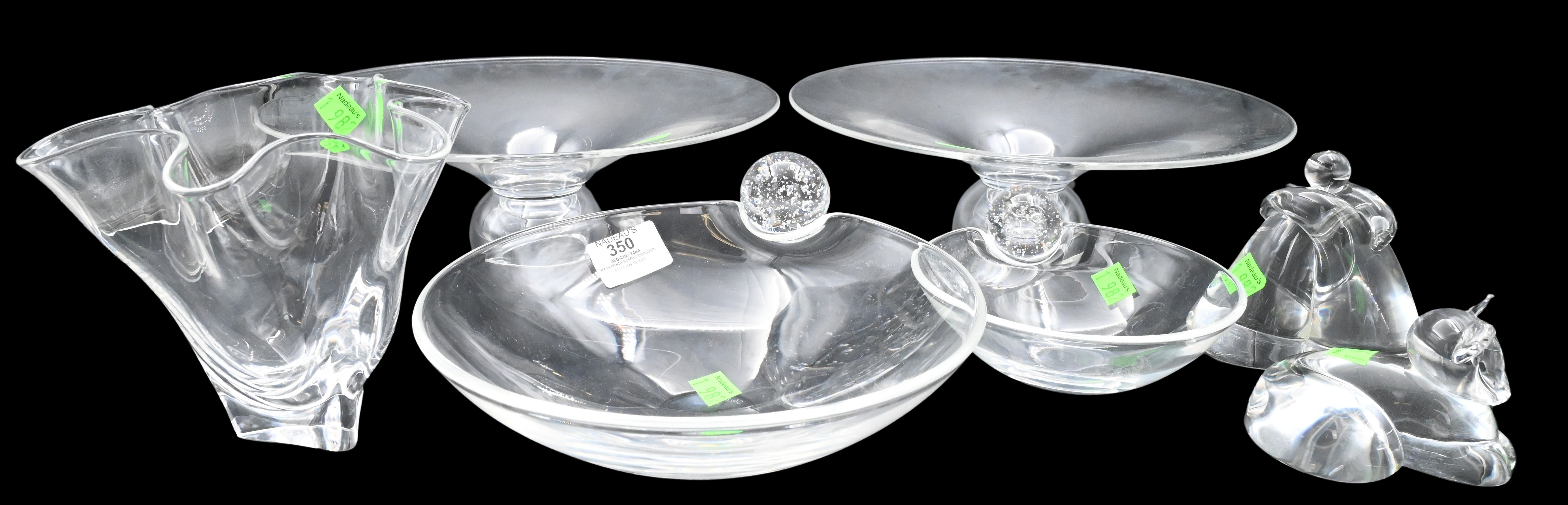 “Love Embrace” paperweight, cat paperweight, two pedestals, freeform vase, along with two candy dishes/bowls, each signed on base, some with original boxes