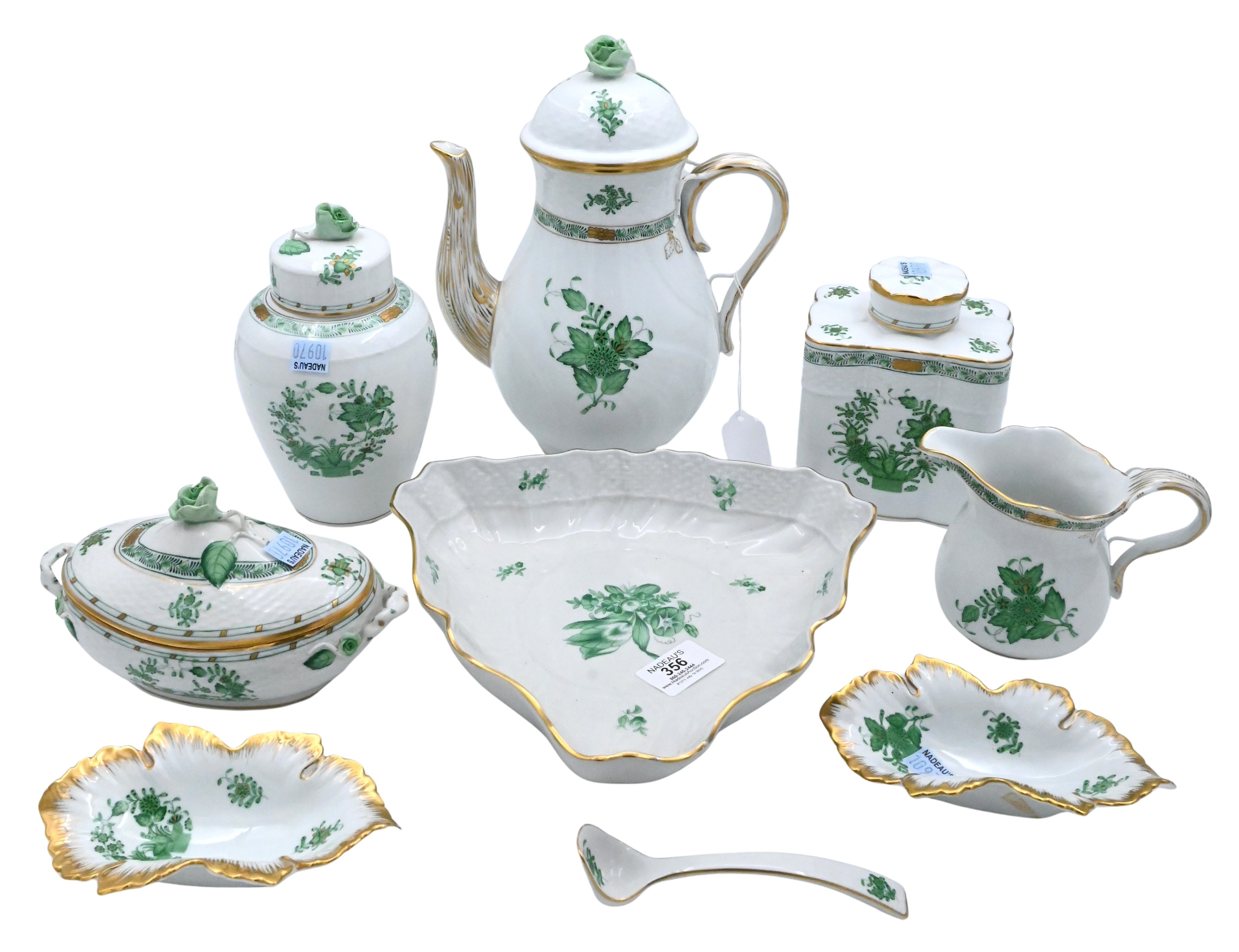Nine Piece Herend Porcelain “Chinese Green Bouquet” and “Indian Basket” Partial Tea Service to include