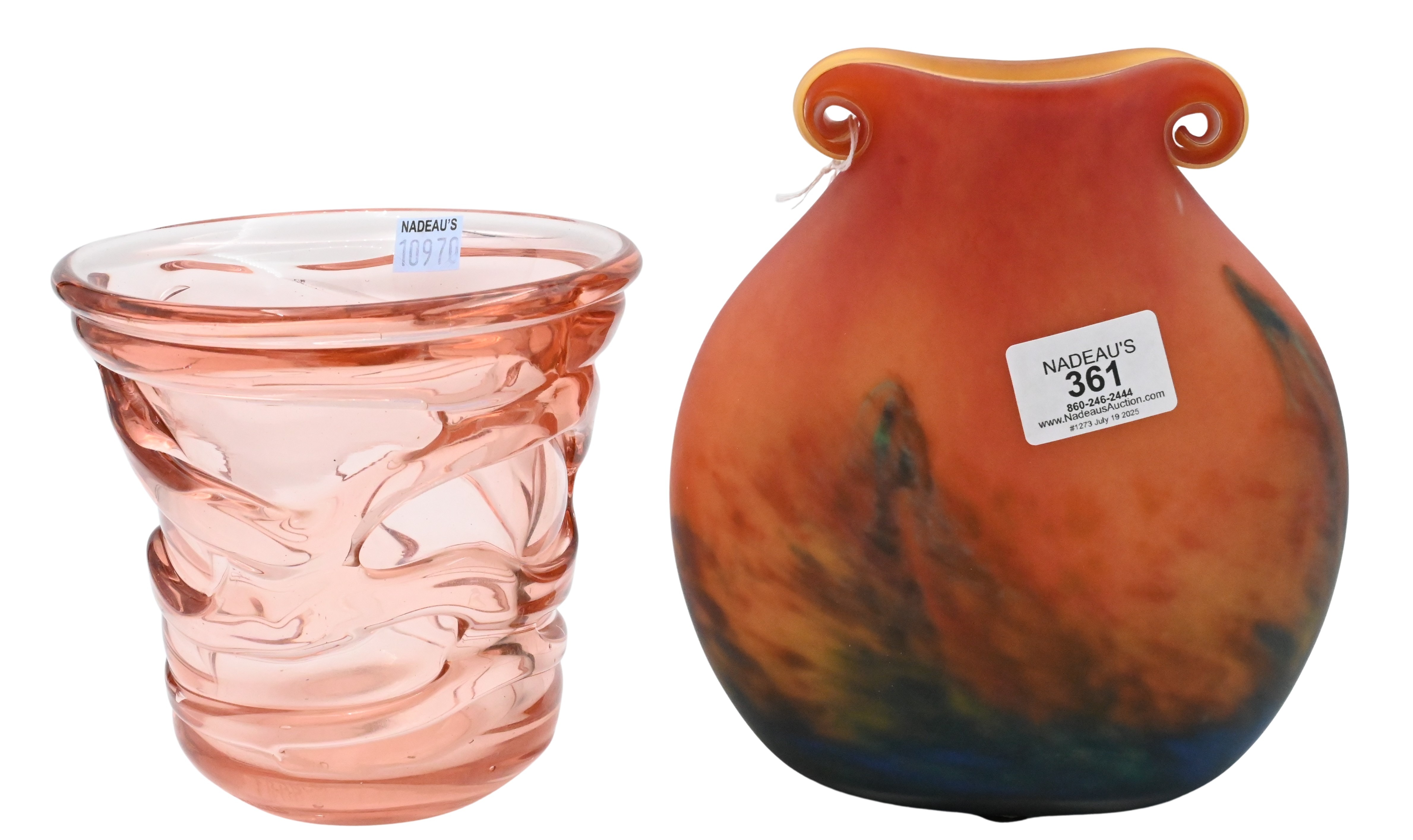 Le Verre Francais matte cased vase having yellow interior with blue base, signed, height 7 1/2 inches, along with pink and clear raised pattern vase signed Schneider France on base, height 5 3/4 inches