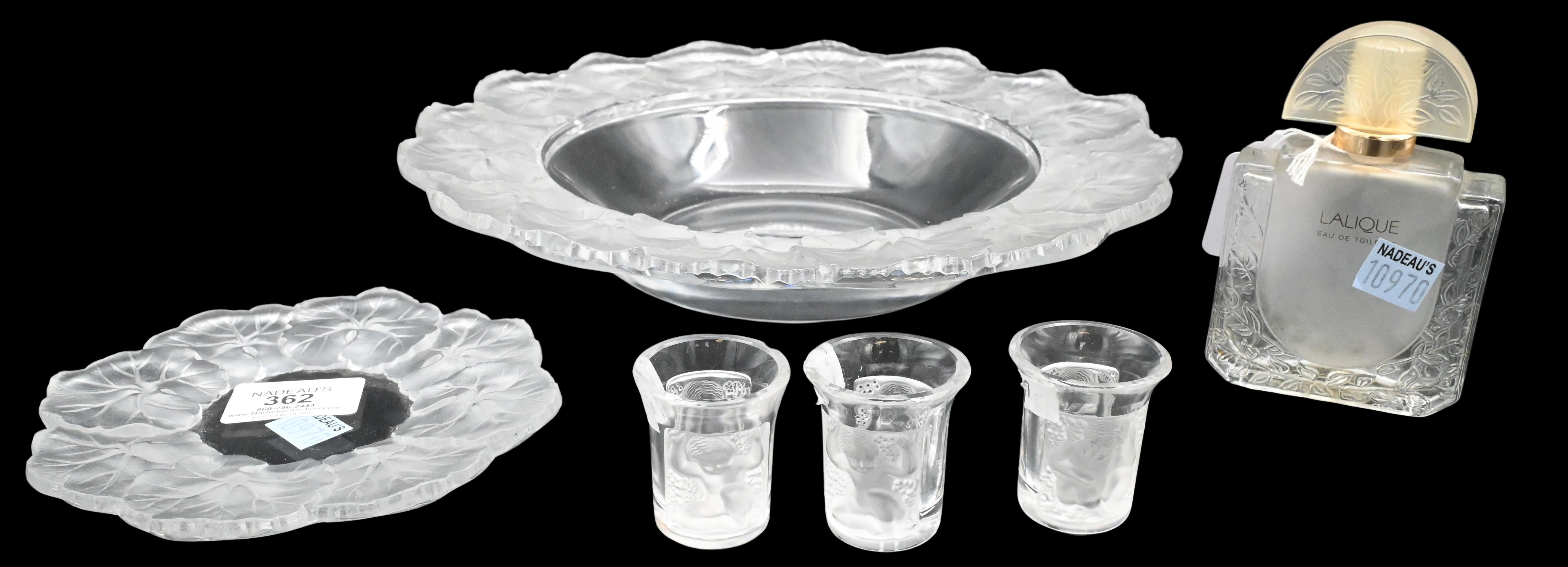 three “Les Enfants” shot liqueur glasses, Lalique “Eau de Toilette” perfume bottle