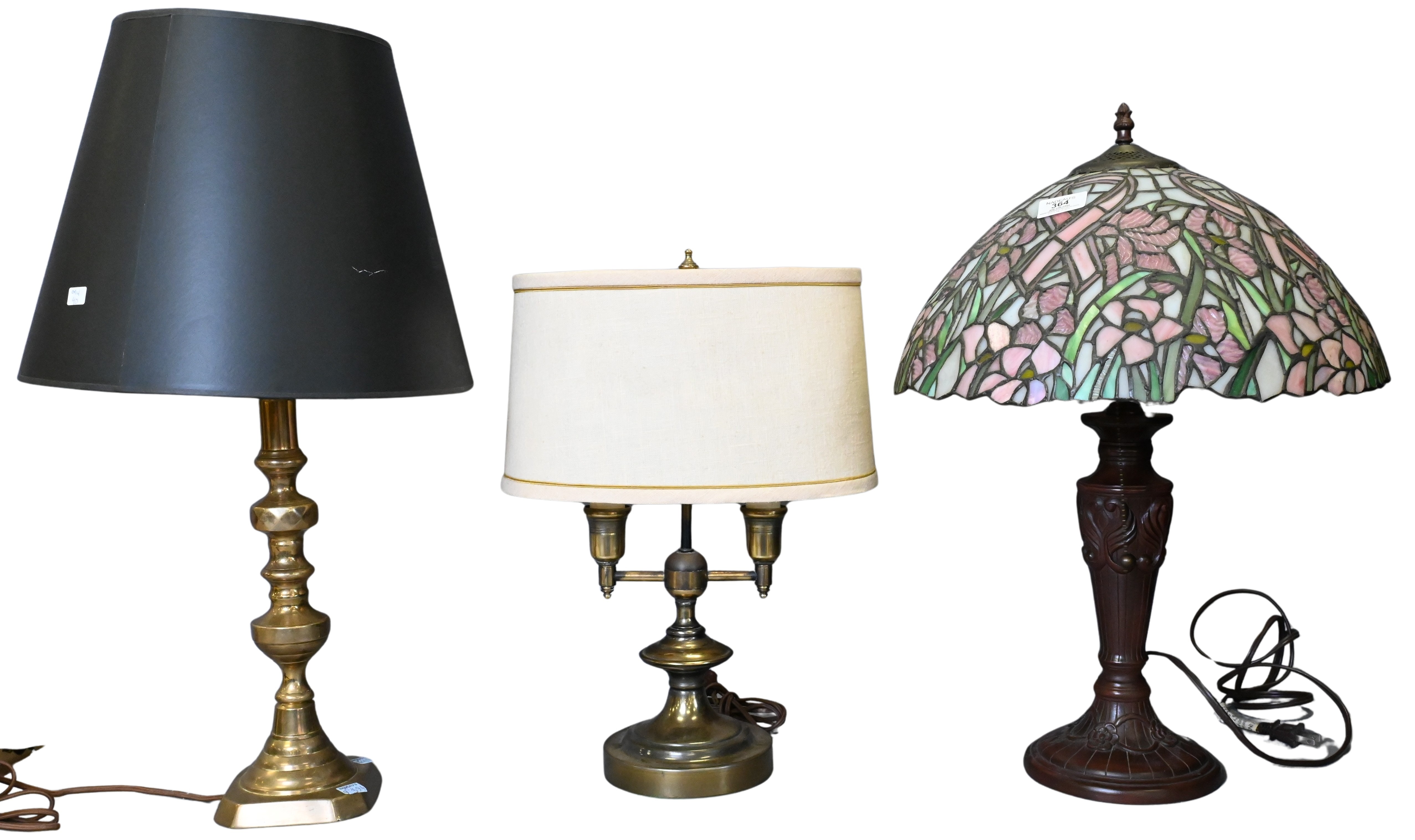 to include three brass lamps, Waterford style cut glass lamp, pair of ceramic lamps, along with a figural lamp and a Tiffany style slag glass lamp