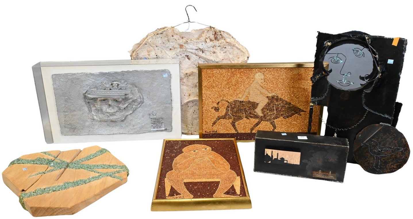 sculpture, two corn and seed mosaics of man and bull and seated man, metal sculpture with a city silhouette, each signed