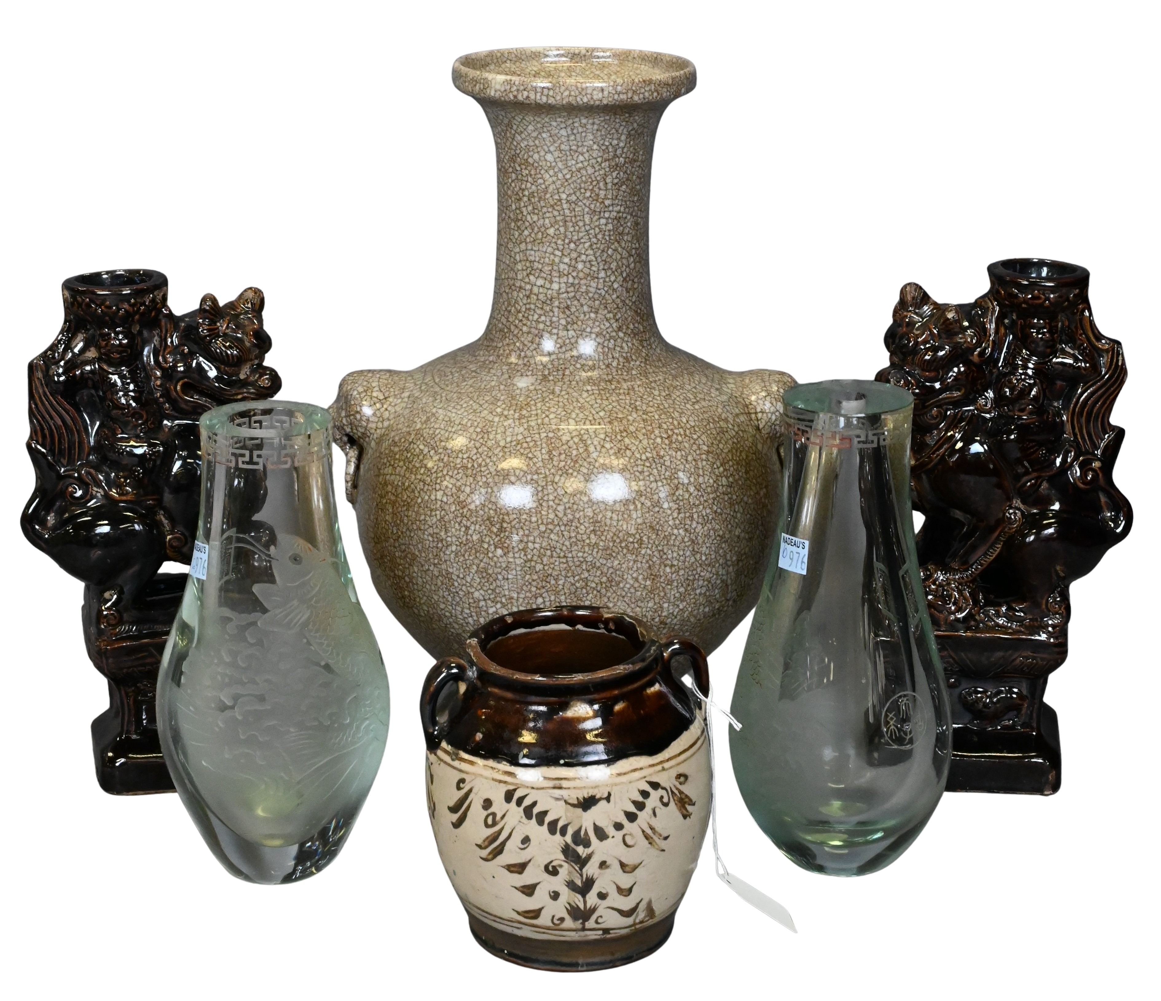 pair brown glazed figural foo dog candlesticks, brown and cream glazed double handled jar, crackle glaze vase having lion mask handle along with a pair of teardrop form etched glass vases with fish motif