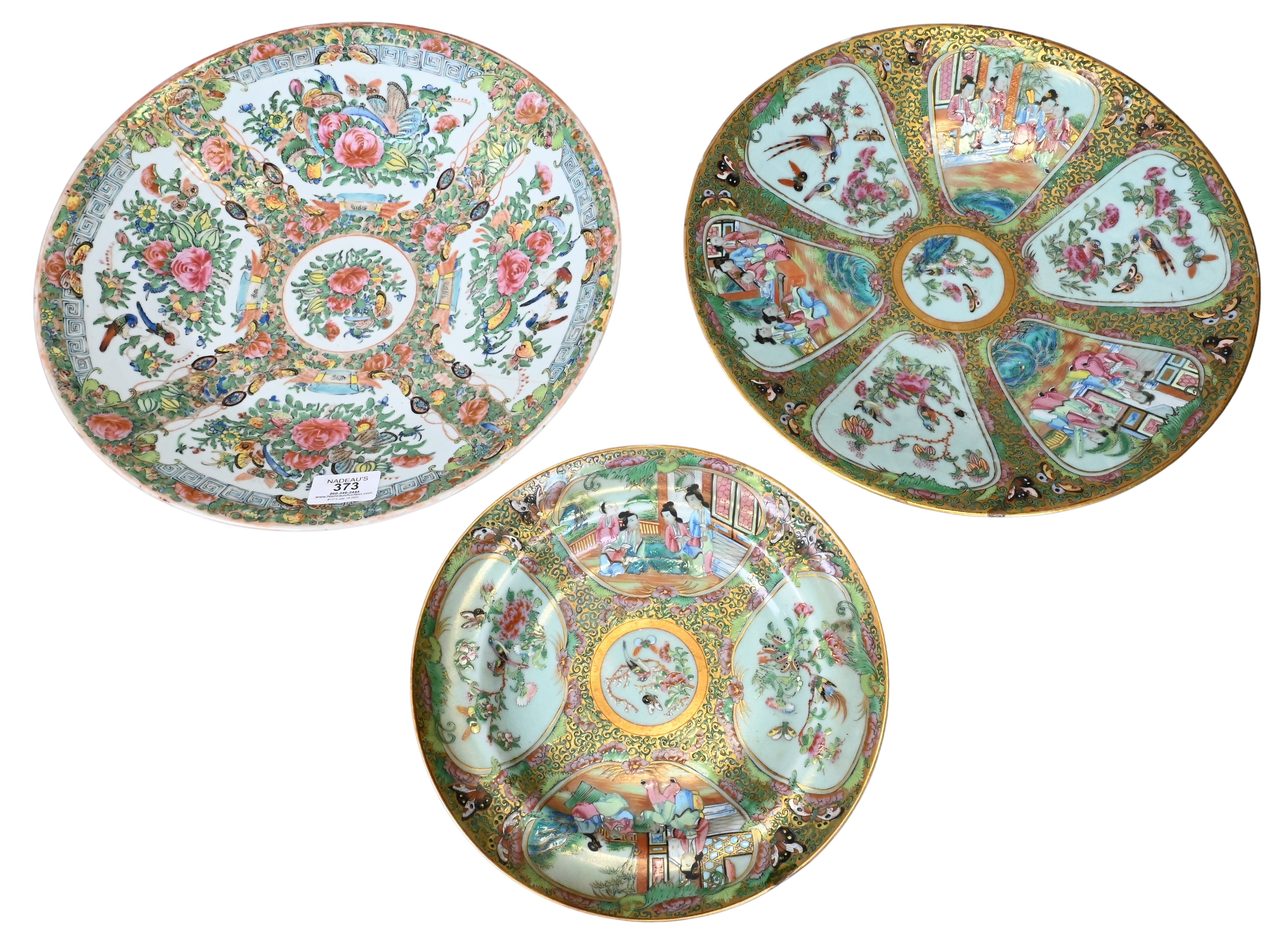 to include two Famille Verte plates having green ground, each decorated with birds and butterfly motif