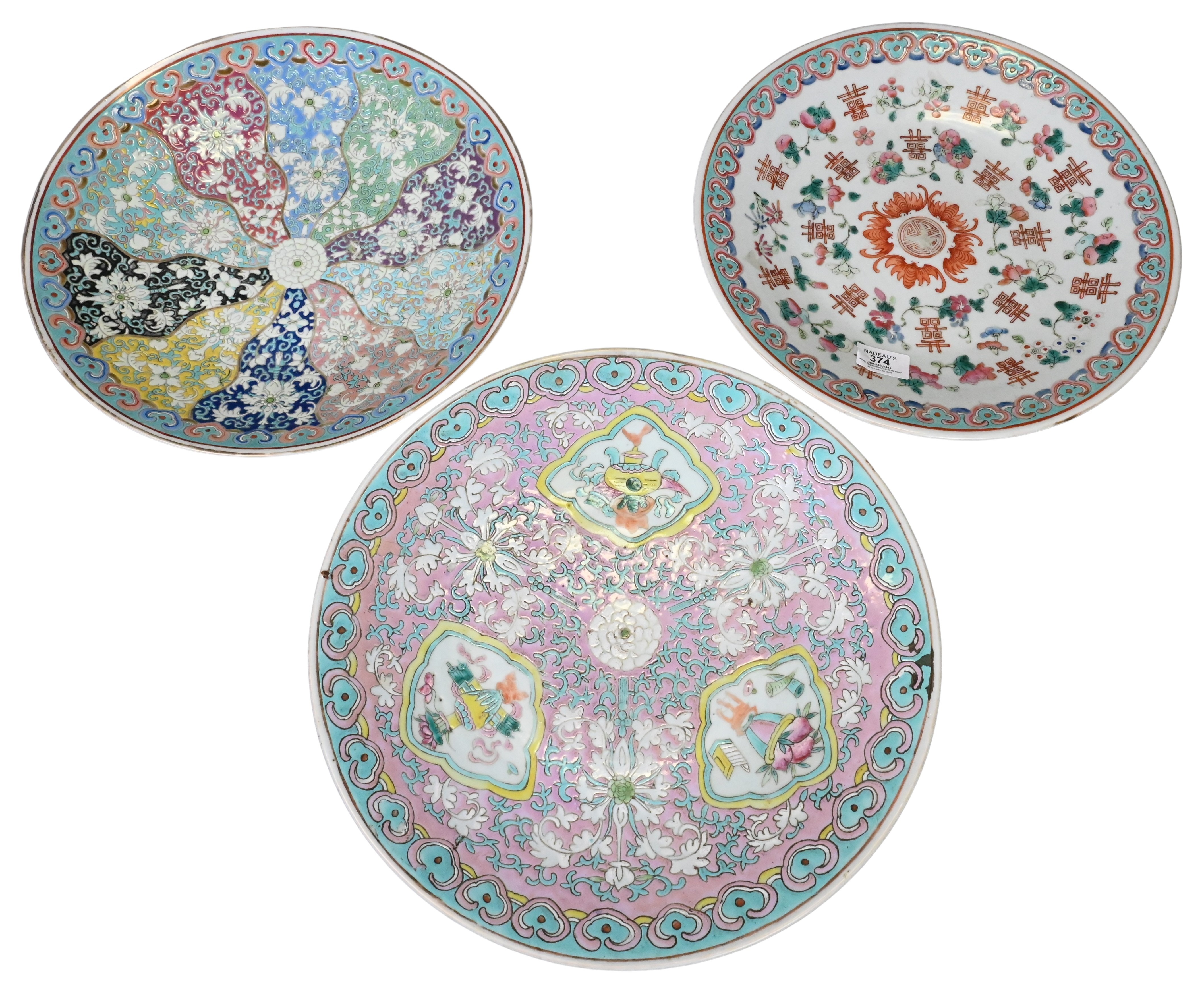 to include one Famille Rose plate having bats and peaches, one purple ground with cartouches and one polychrome enamel with center flower and pinwheel design