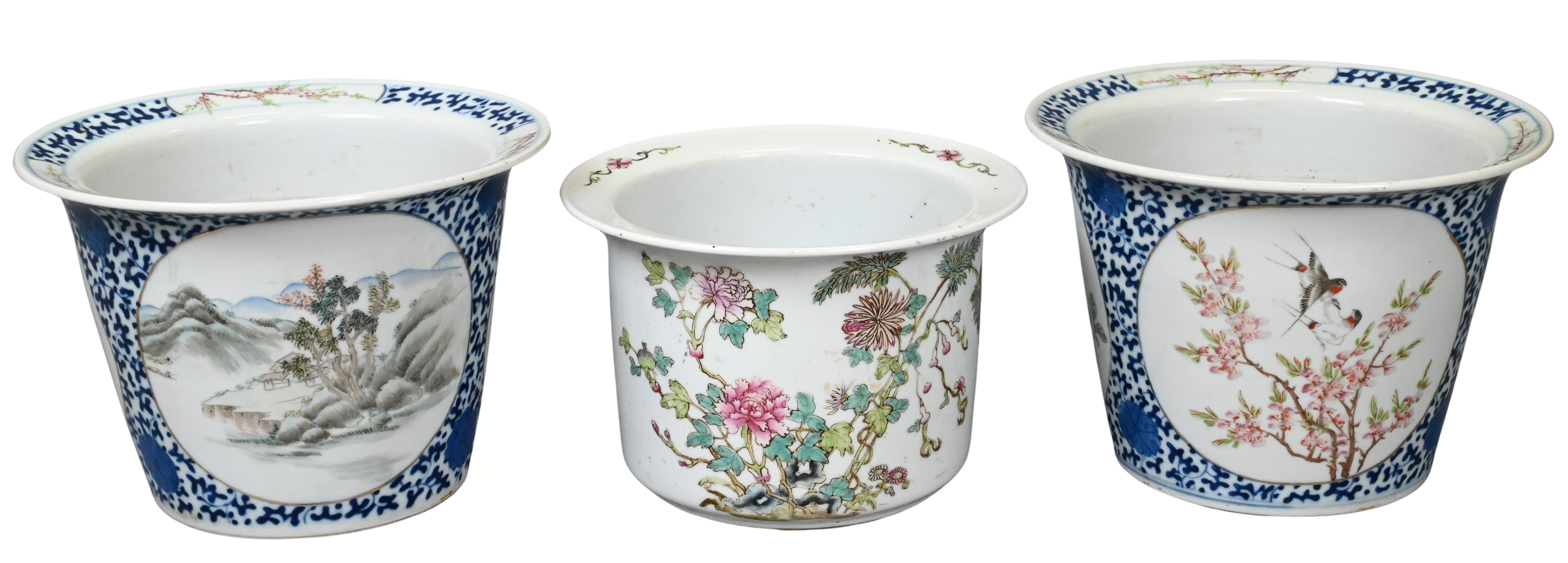 to include pair of export pots having scrolling blue and white border with round cartouches featuring sparrows and cherry blossom branches along with a Chrysanthemum flower and enameled ball planter, each with drainage hole