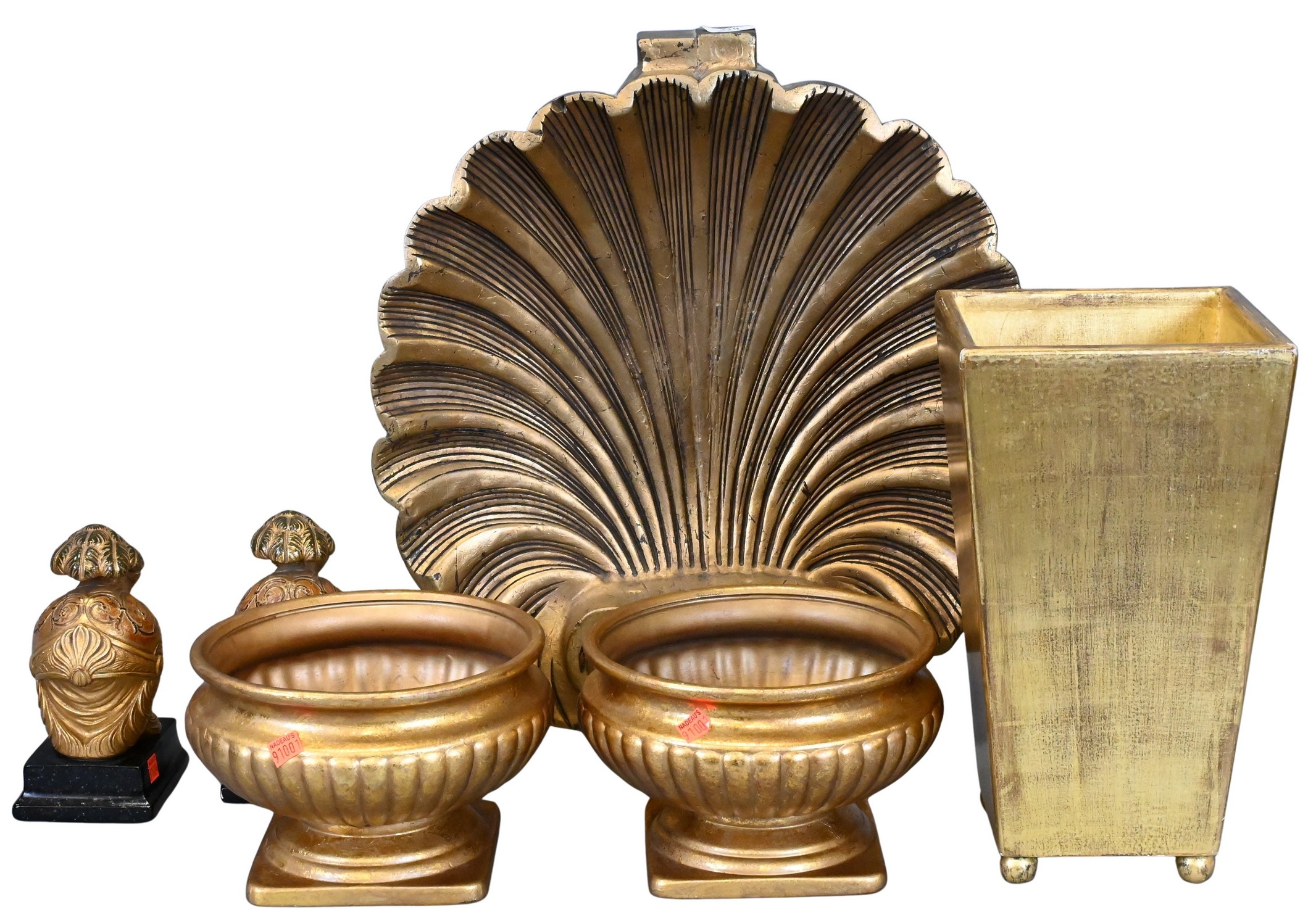 to include large carved giltwood shell wall plaque, waste bin on ball feet, a pair of Borghese helmet bookends, along with a pair of gilt metal Neoclassical style planters
