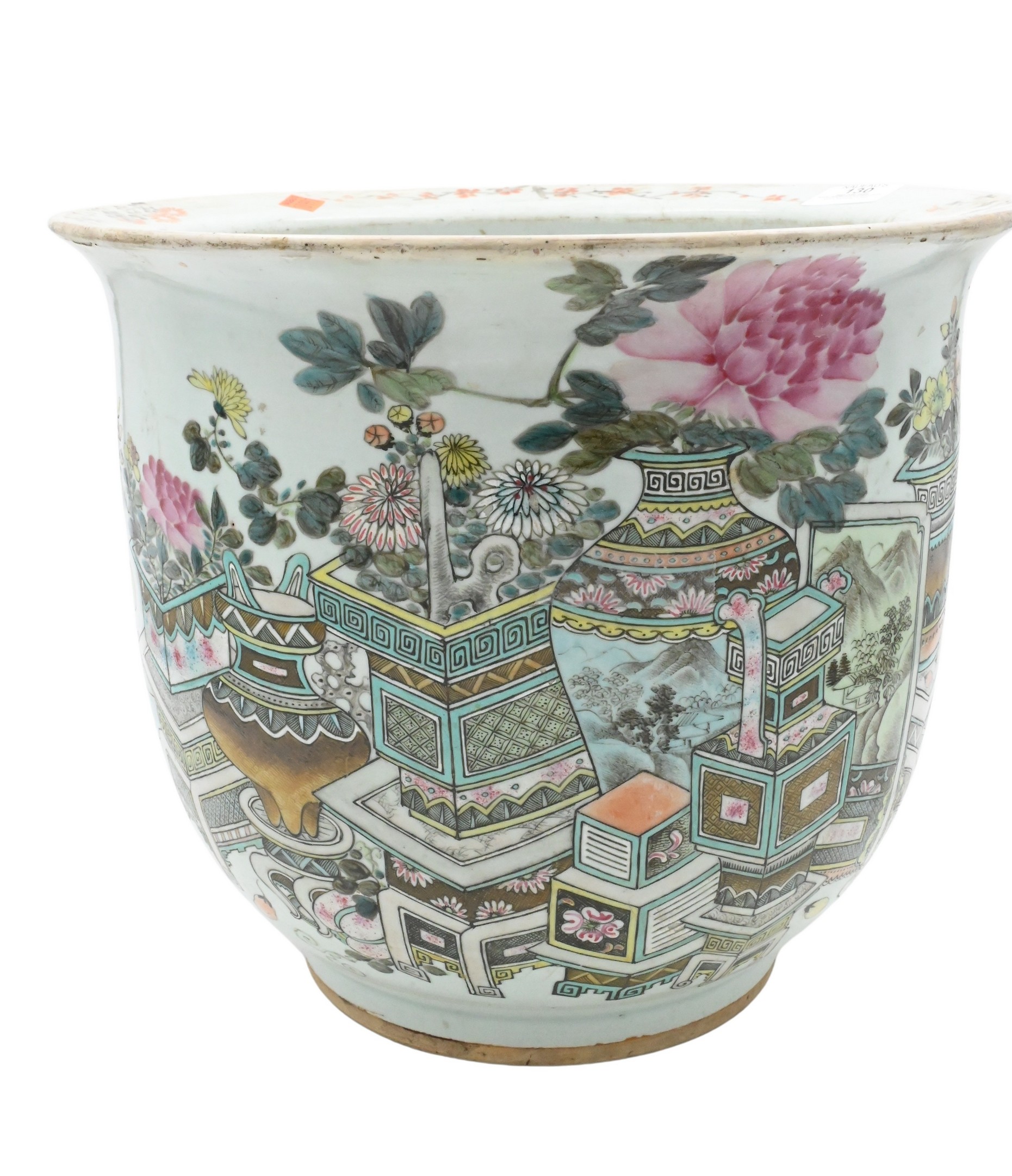 having antique and precious objects motif with character mark poem verso, drainage hole to bottom