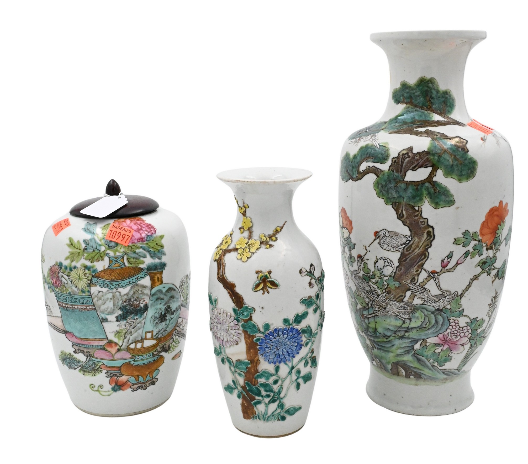 vase having enamel crane, peonies and tree motif, smaller flared rim vase with high relief enamel chrysanthemum and butterfly design along with jar having antiquities and flower motif, character marks to underside