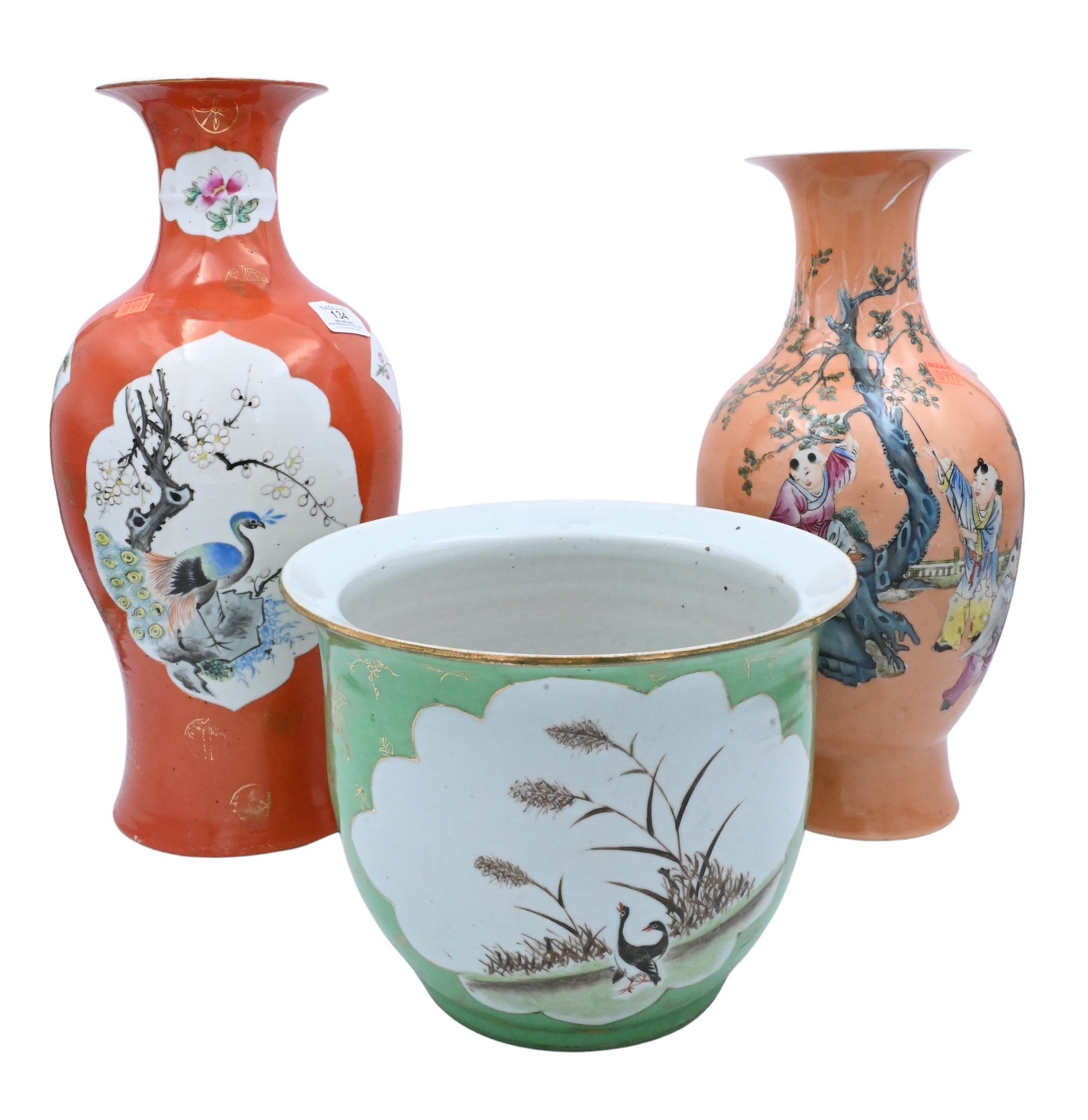 one red/orange coral having peacock and pink peony cartouches with gilt circular medallions, along with light orange ground playing boys vase along with green planter with gilt accents and rooster and duck bird motif