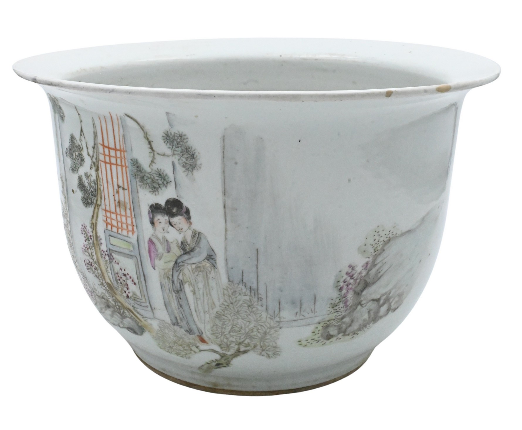 featuring geishas in a courtyard and playing boys motif with calligraphy poem, drainage hole to base