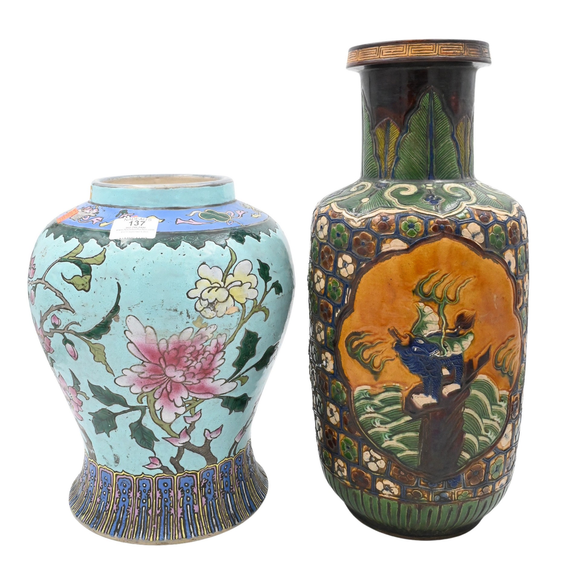 sancai glaze biscuit vase having enamel mythical creature/dragon amongst waves motif with flower border, height 17 1/2 inches, along with light blue ground lotus vase of baluster form, height 13 inches