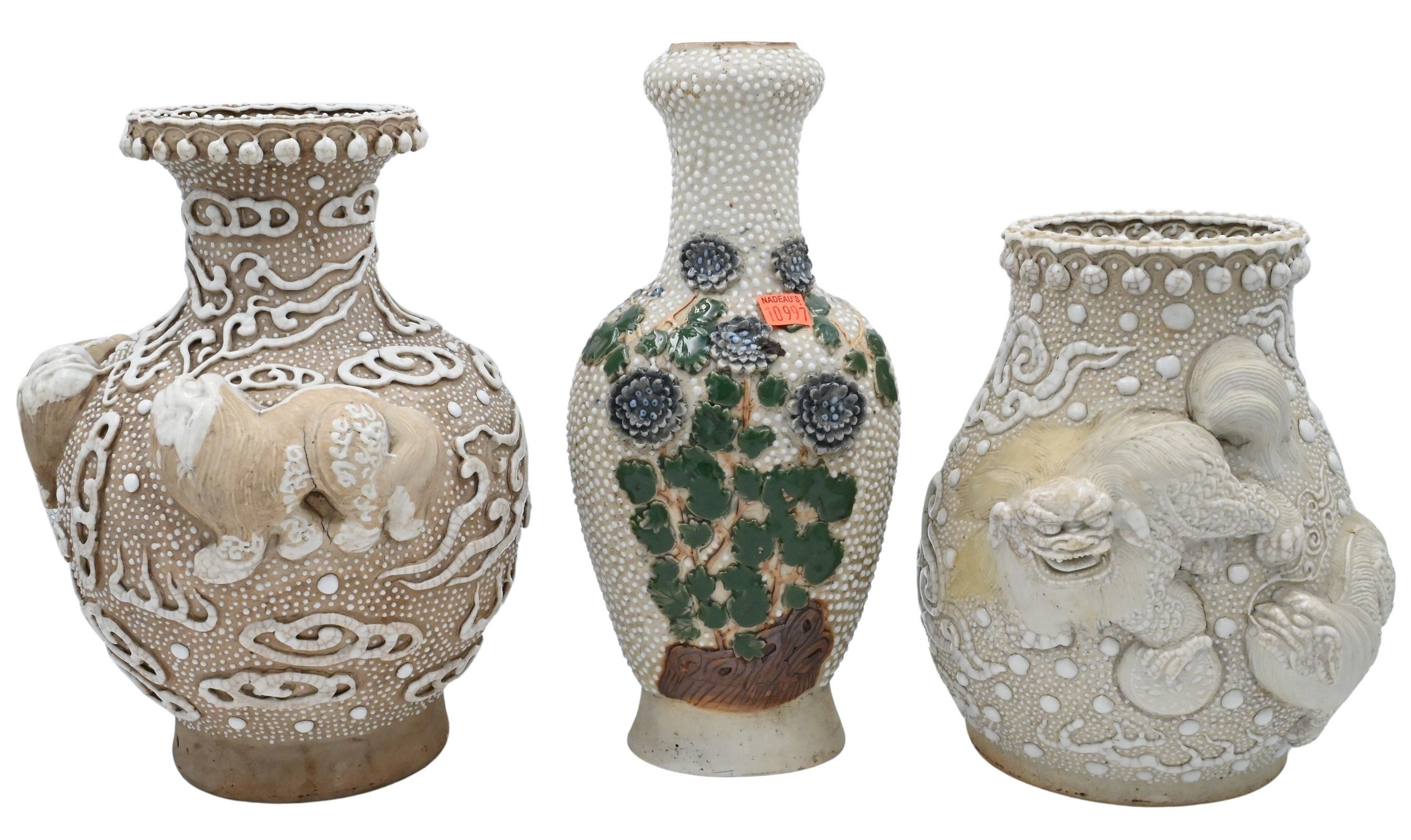 to include white and cream foo lion vase with high relief pearl white beads and applied foo lions amongst clouds, Hu form vase with foo lions amongst clouds along with vase having high relief enamel flower bouquet design, character marks to underside