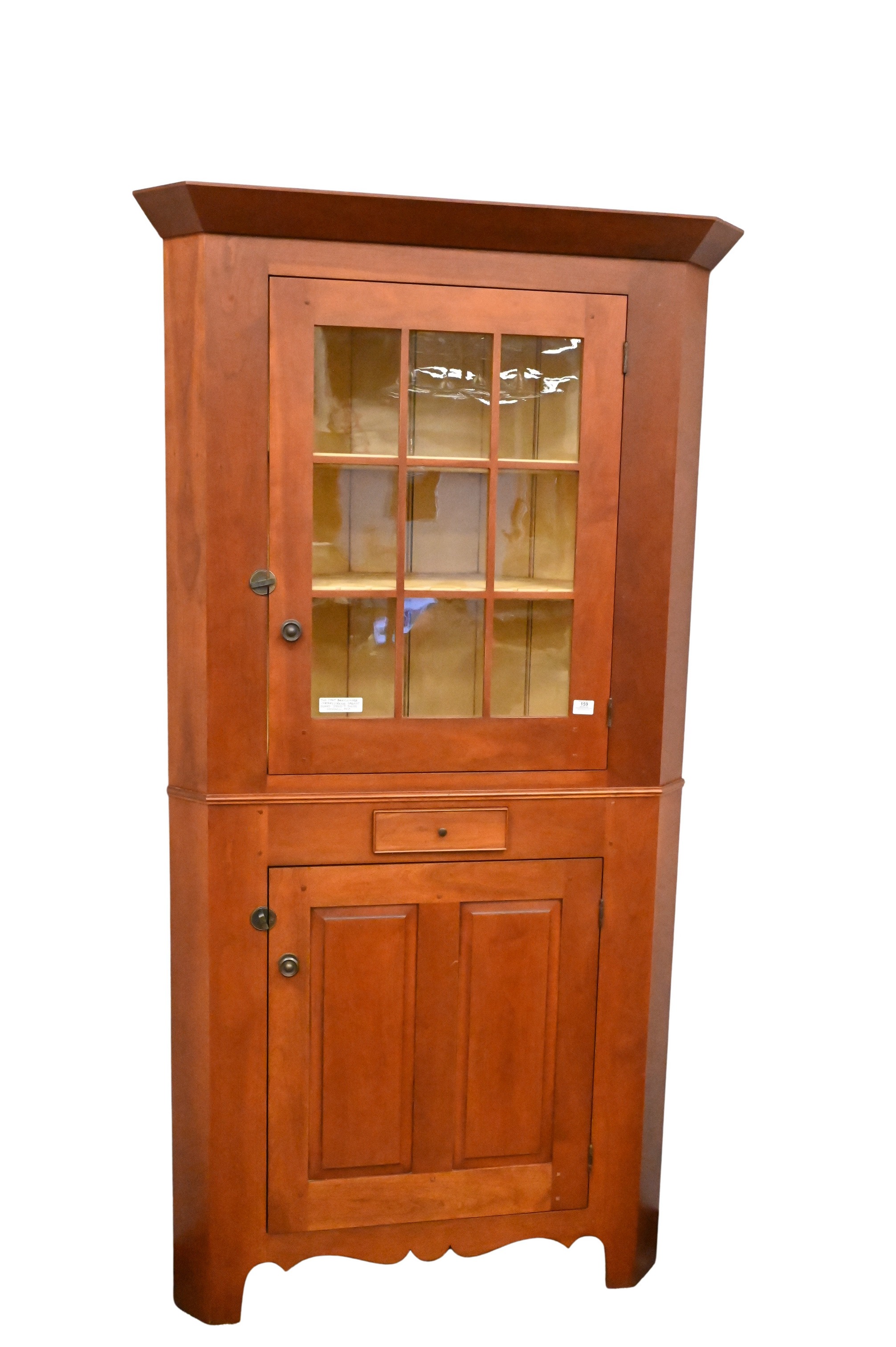 in two parts having a nine pane glass door, with three shelves over small drawer and bottom door, signed David T. Smith, Ohio