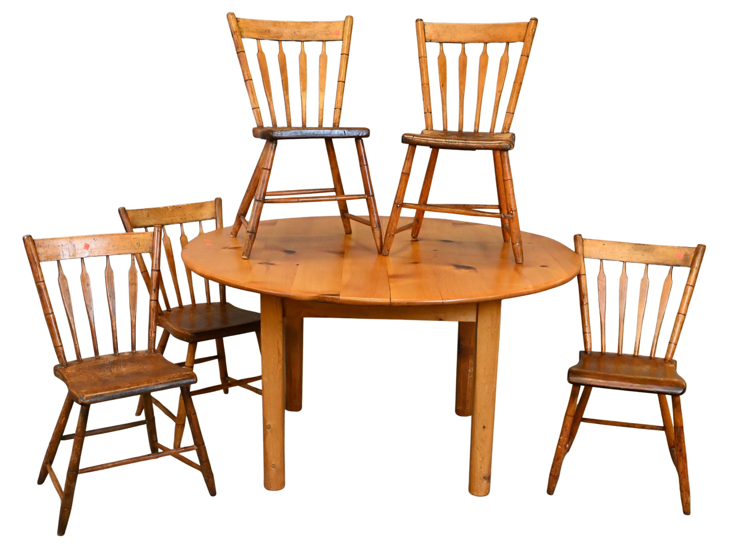 to include round pedestal table with painted fruit top and four armchairs having rush seats