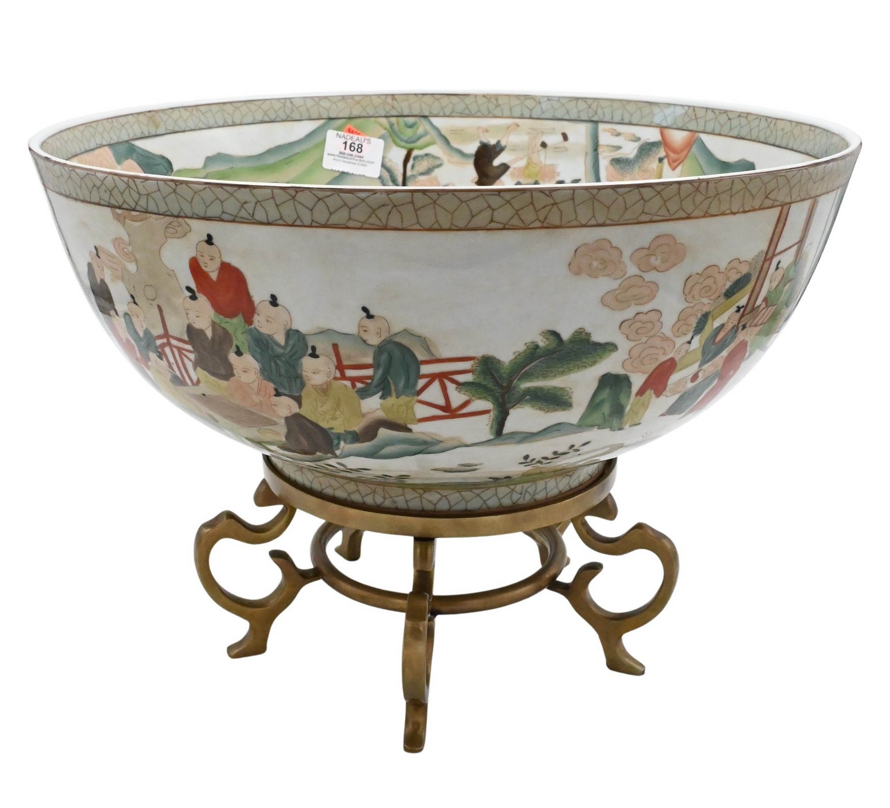 featuring crackle glaze painted rim over motif of boys playing in a mountain landscape with mythical creatures