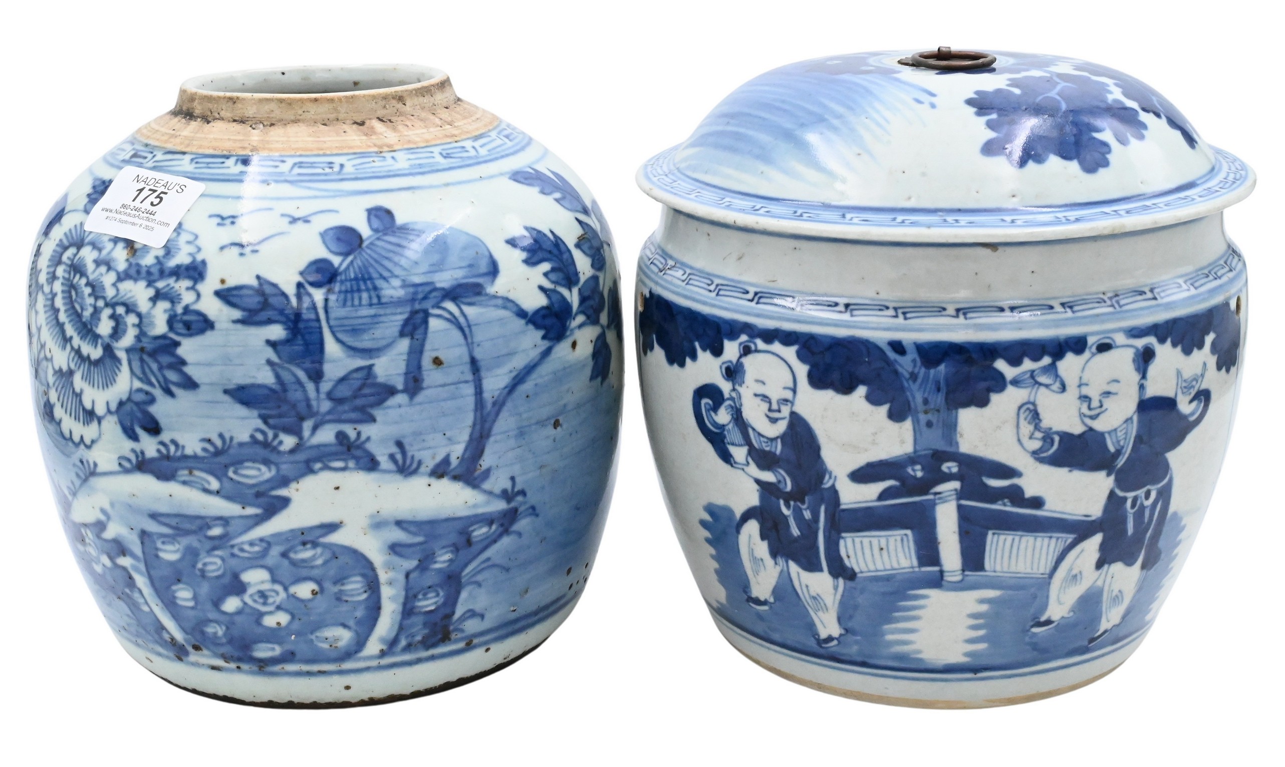 to include ginger jar having flower design and remnants of brown wax seal along with covered jar with playing boys and drilled holes for wire handles