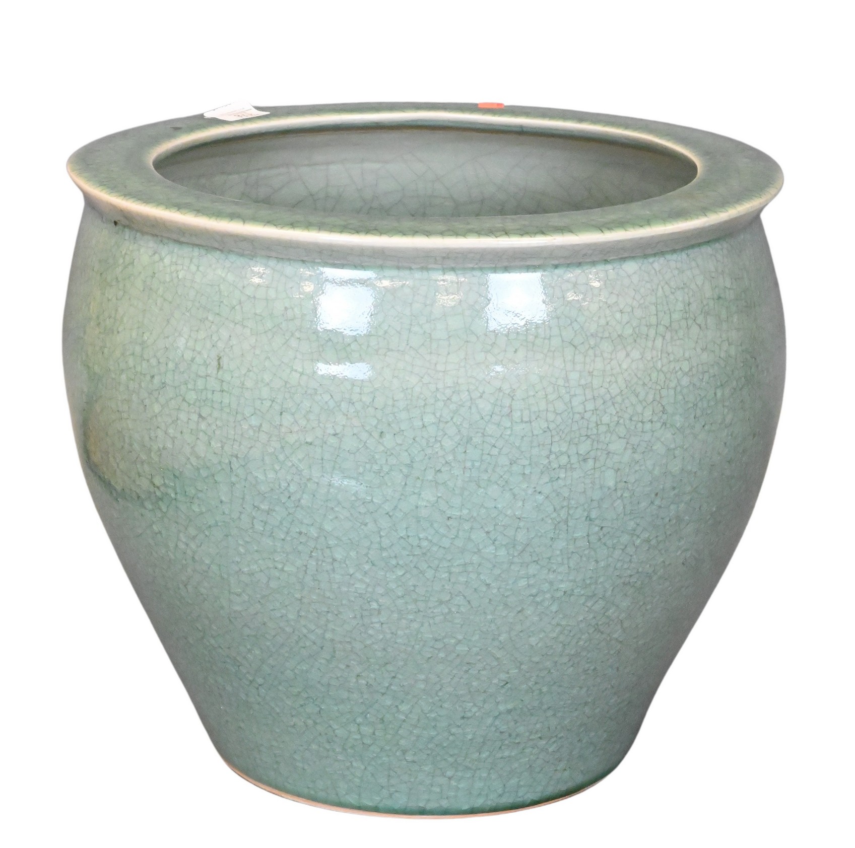 to include one larger planter with flared rim and bird and tree branch design, one having landscape with lotus flower pond and ducks along with one having scholar motif