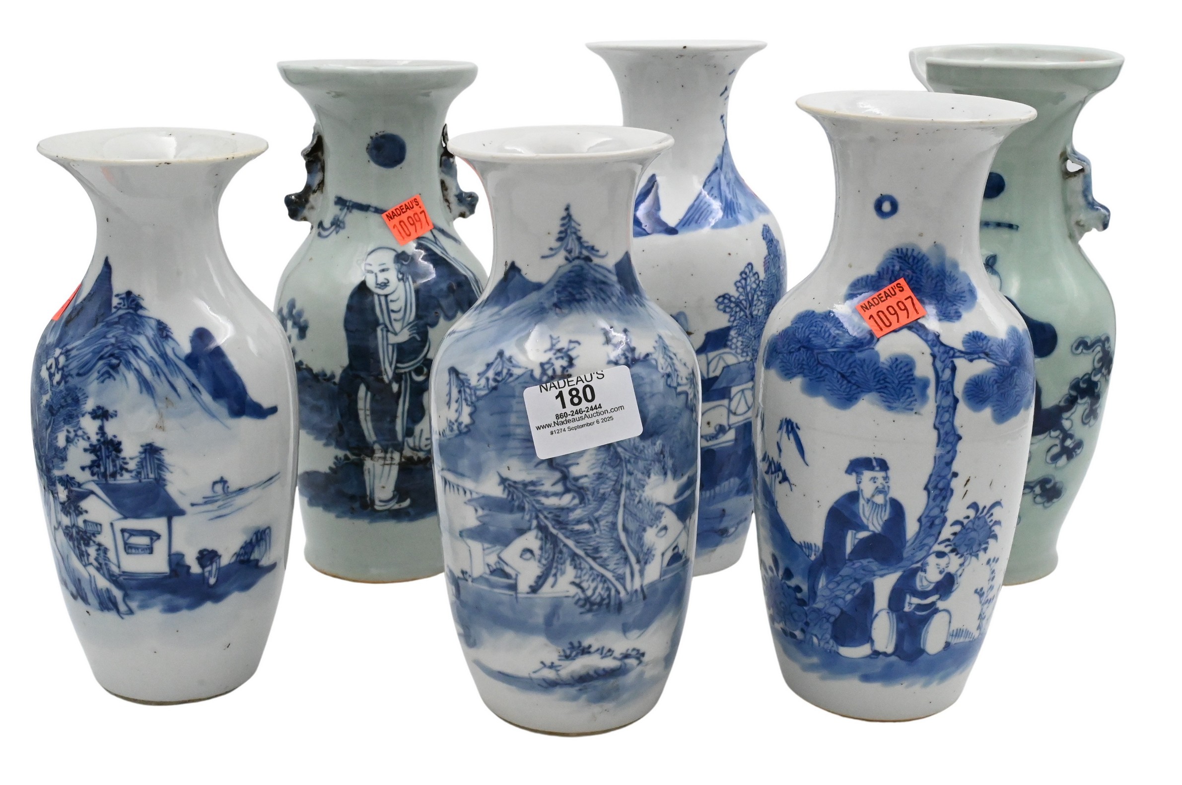 each having flared neck over tapering body with mountain village and scholar motif, two having celadon ground with playing boys motif and foo dog handles
