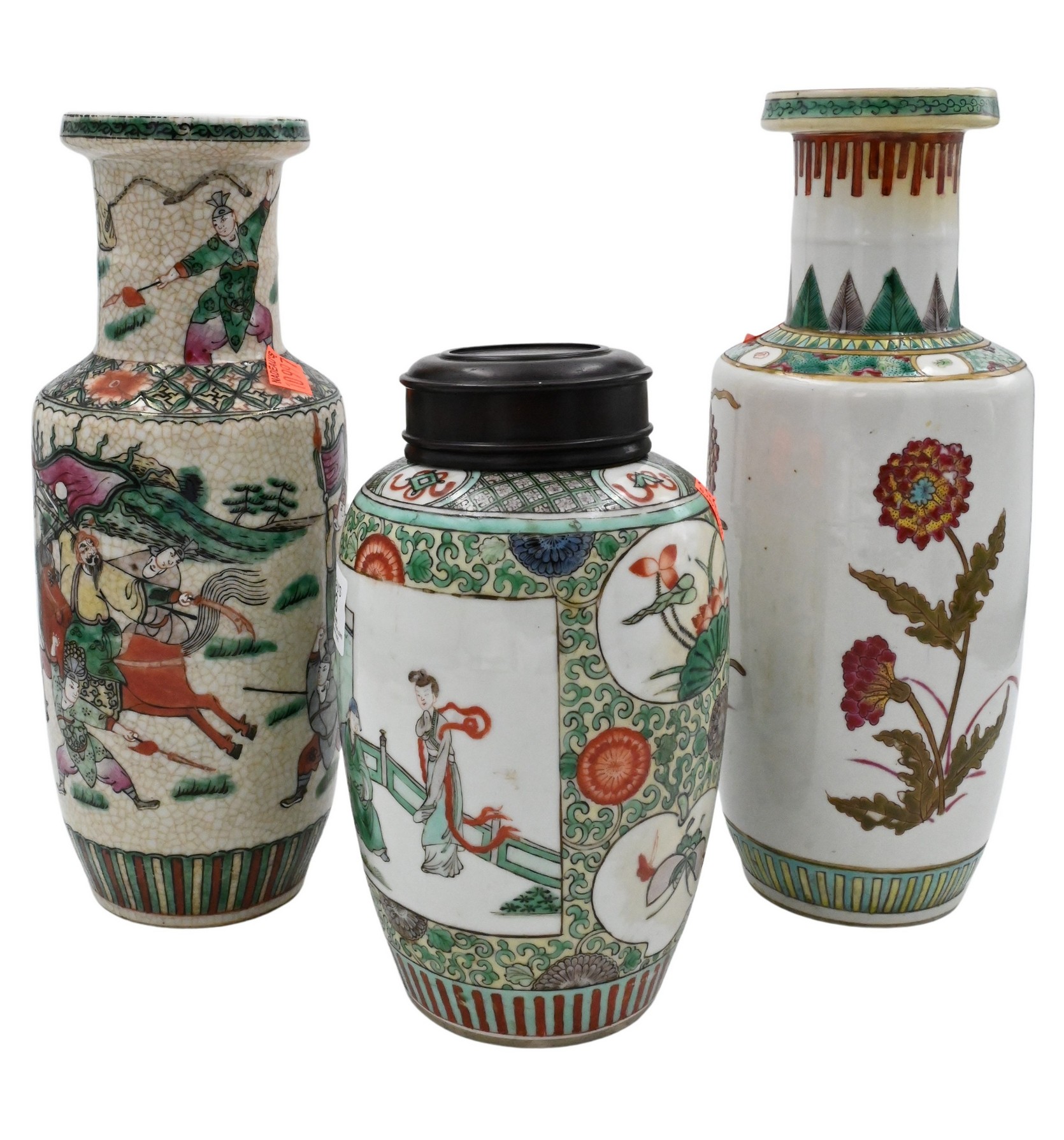 crackle glaze warrior vase with battle scene, vase having enamel flower motif and character marks to base along with green jar having geisha and scholar motif
