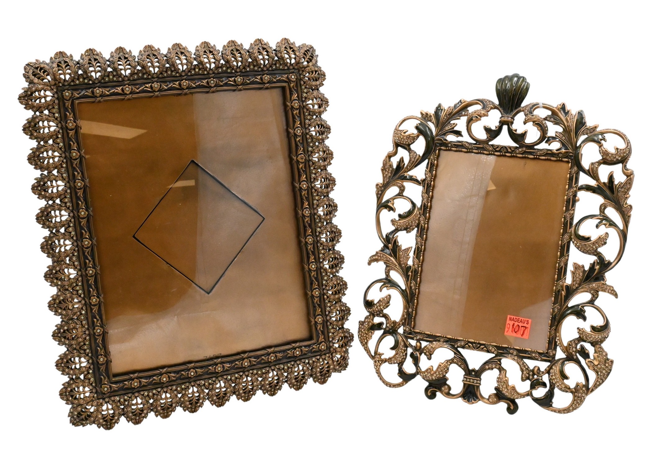 Art Nouveau style frame having scrolling foliate erinite green frame with topaz color stones No.7439, 11 1/2″ x 9″, along with Roman Holiday frame in museum gold No.7457 4261-1, 12″ x 10″ marked on verso Berebi Limited Edition
