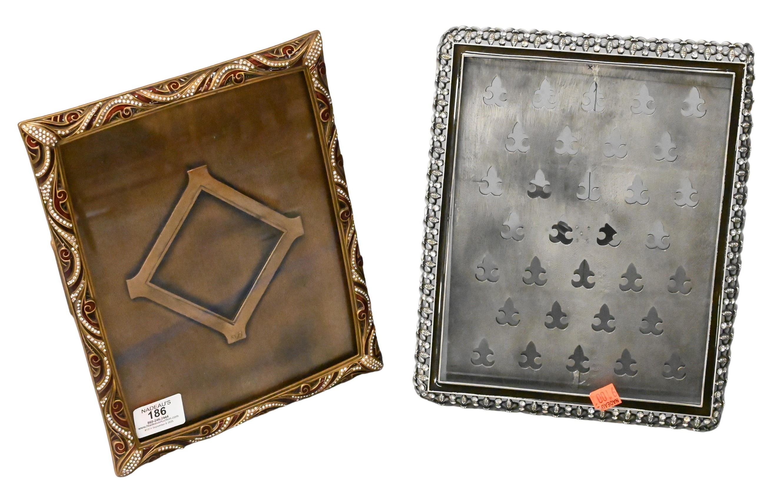 Jay Strongwater Fleur-de-lis bordered frame with Swarovski crystals, labeled on verso, 11″ x 9″, along with Edgar Berebi red enamel and crystal jewel inset frame, No.88__,marked on verso Berebi Limited Edition, 11″ x 8 1/2″